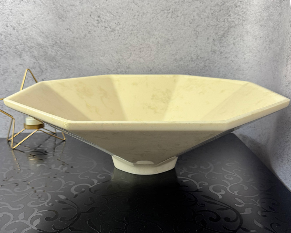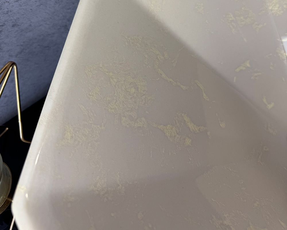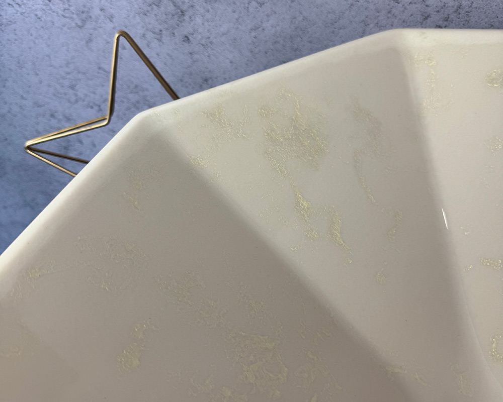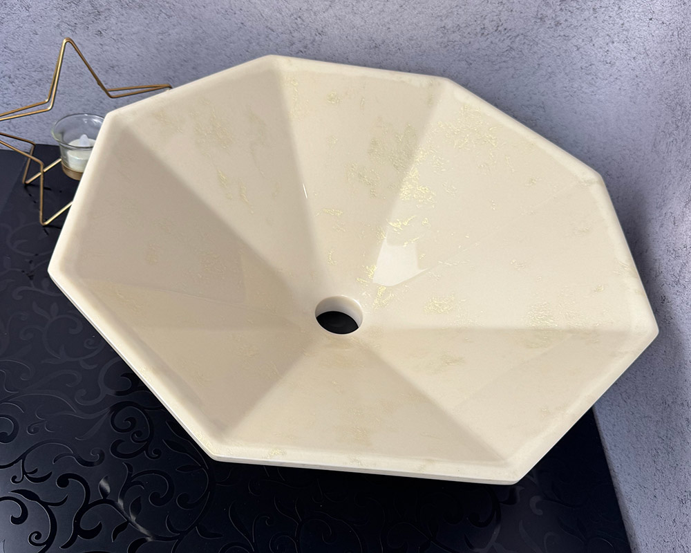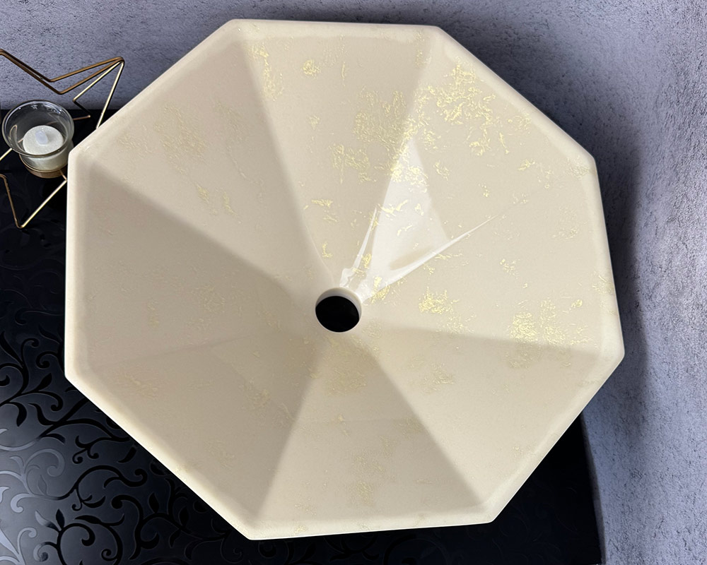 Умивальник має світло-бежевий відтінок із ніжними золотистими переливами, по краю йде біла облямівка, яка створює витончений контраст і додає виробу акуратного, елегантного вигляду.
