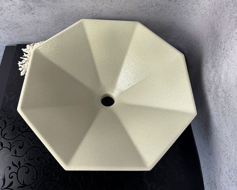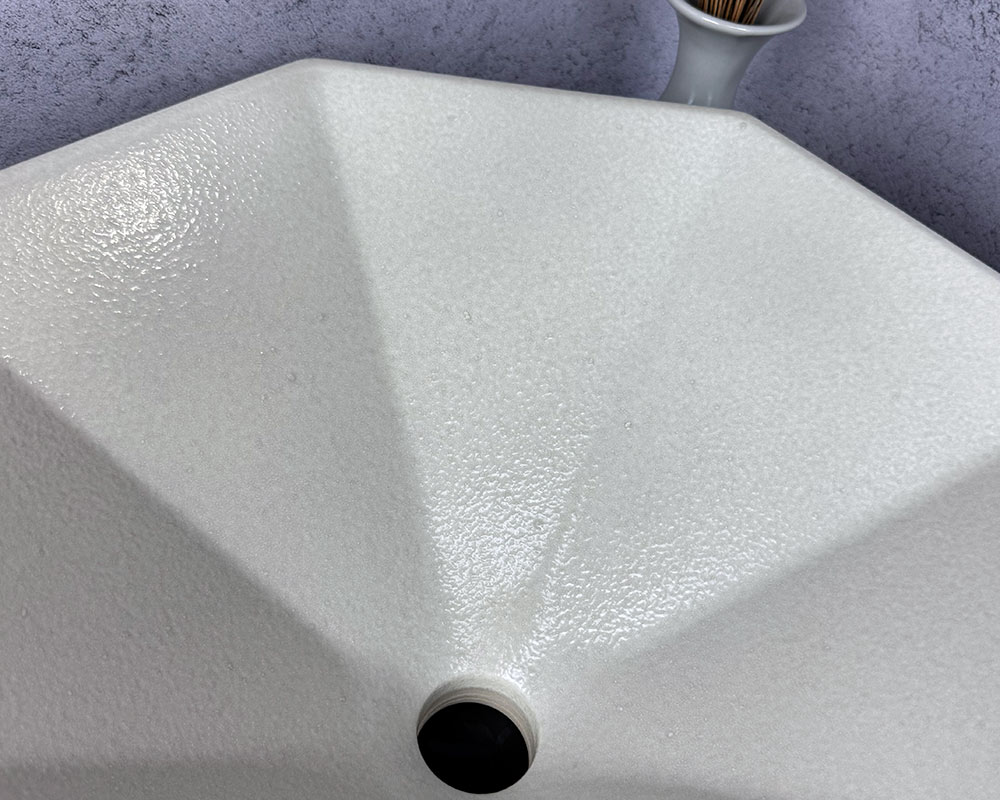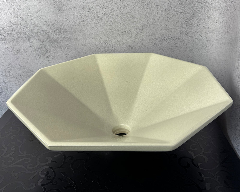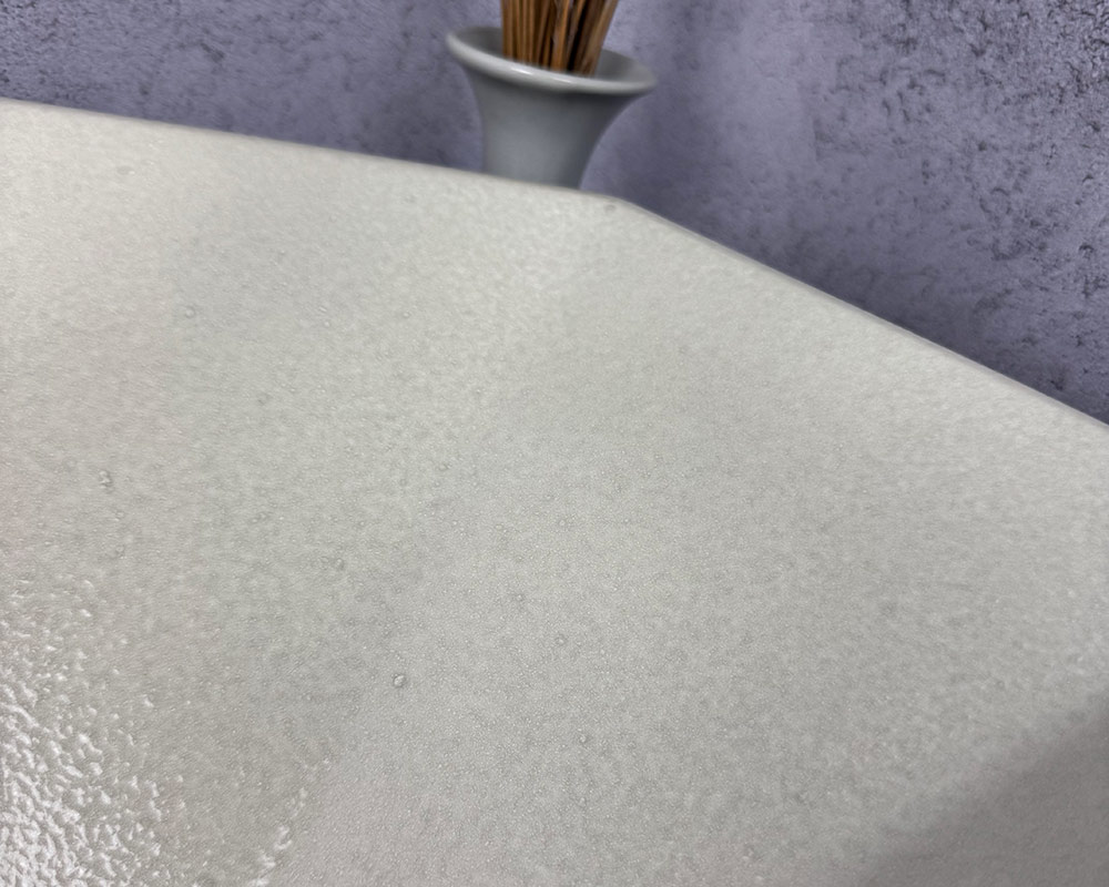 Умивальник має ніжний світло-бежевий відтінок. Поверхня виконана з текстурою шагрень, що надає їй легкого матового ефекту з дрібним рельєфом, завдяки чому умивальник виглядає стильним та сучасним.