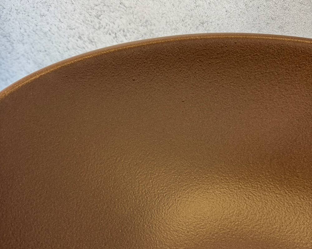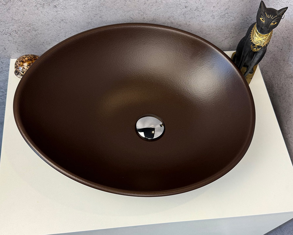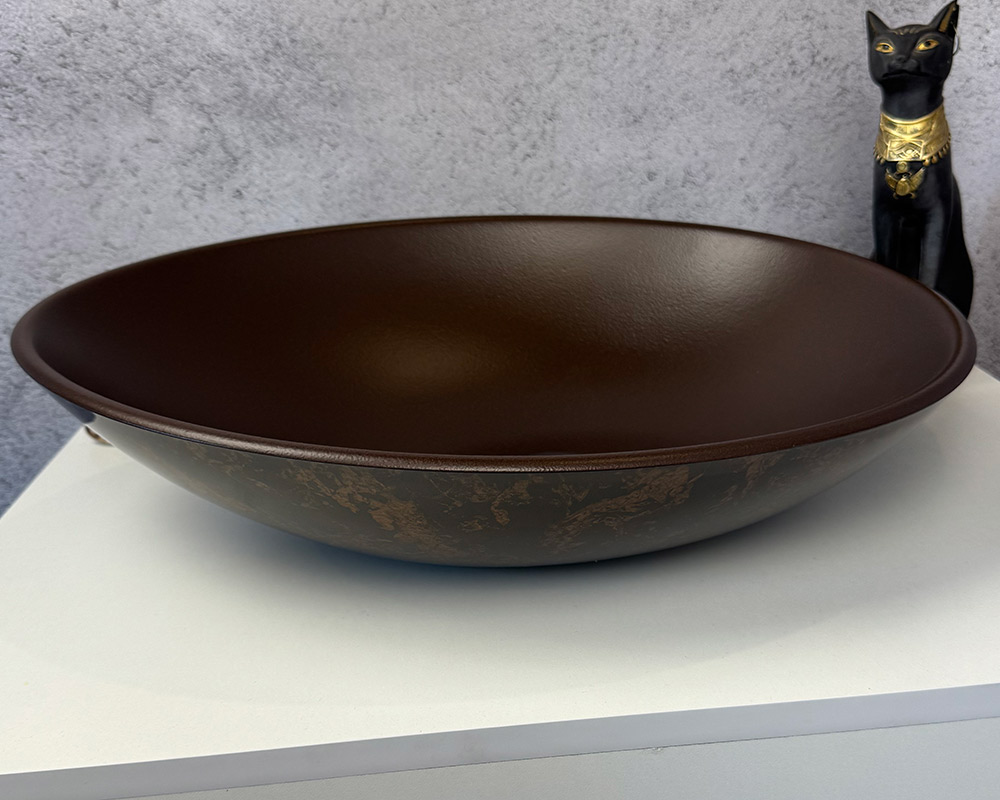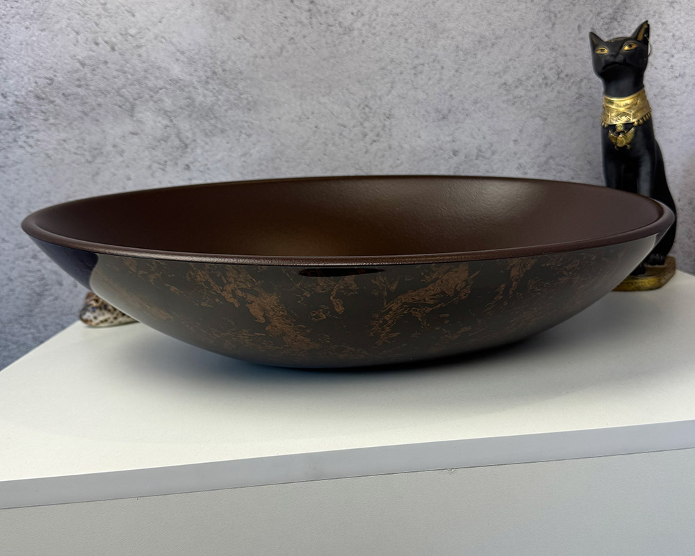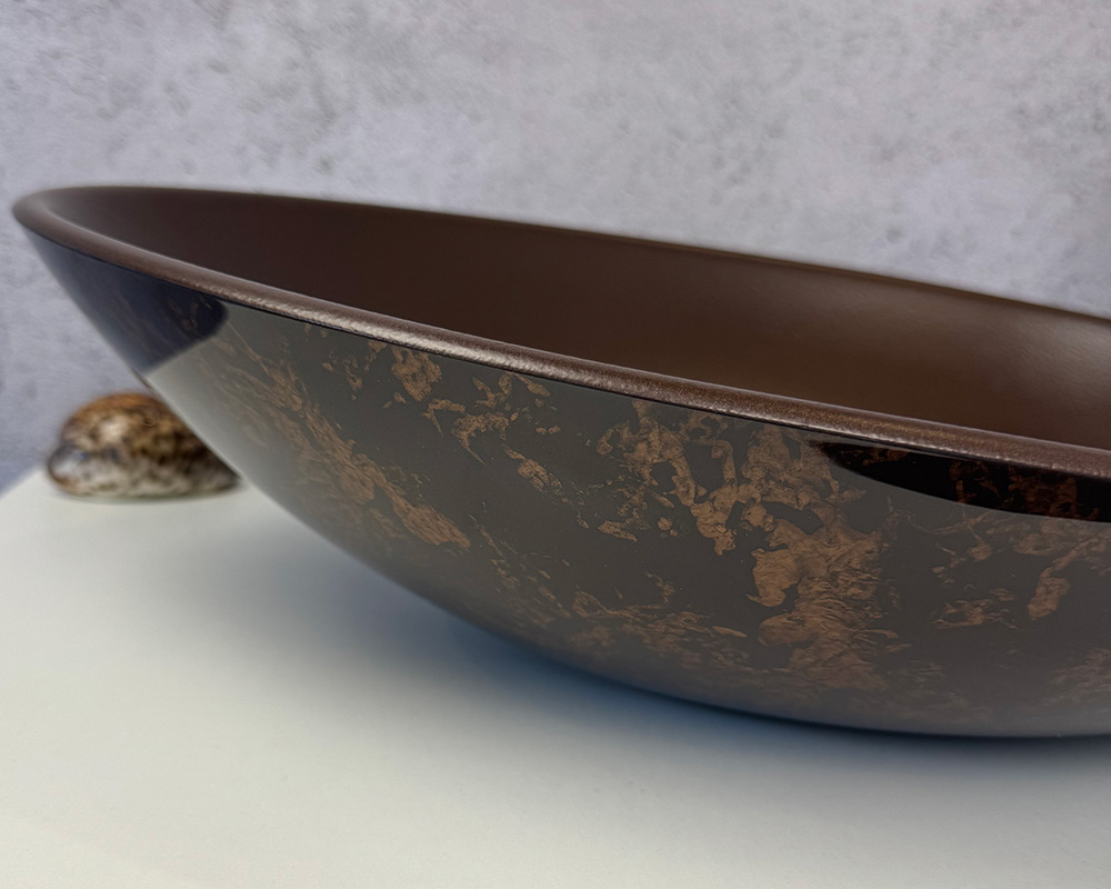 Умивальник виконаний у насиченому темно-коричневому кольорі з благородними мідно-золотистими вкрапленнями. Такий мармуровий малюнок створює ефект глибини й витонченості, надаючи виробу розкішного та стильного вигляду.