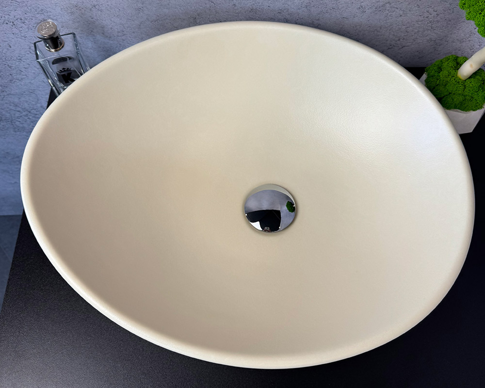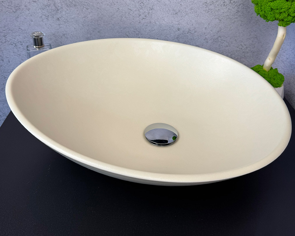 Умивальник виконан у світло-бежевому або кремовому кольорі. Він має теплий, нейтральний відтінок, схожий на слонову кістку або дуже світлий пісочний колір.