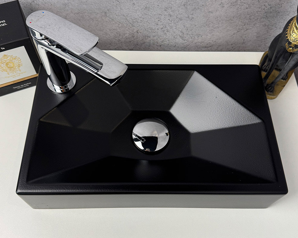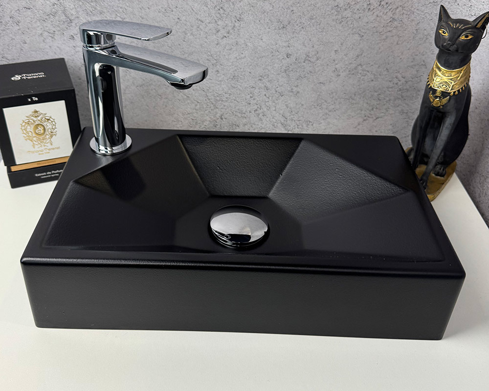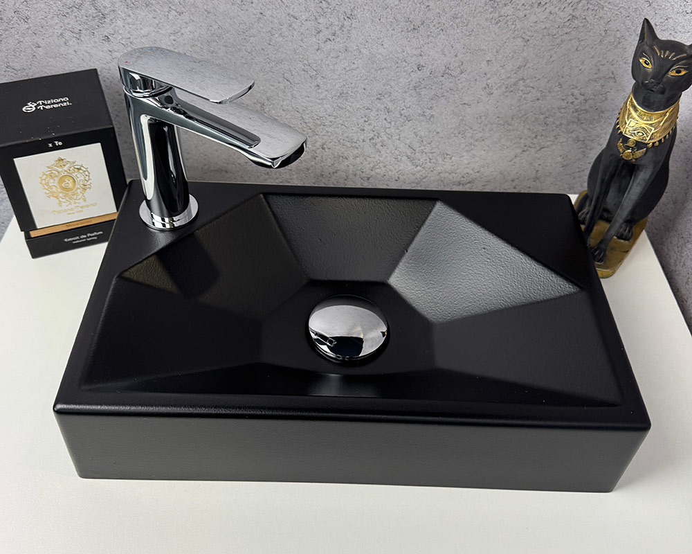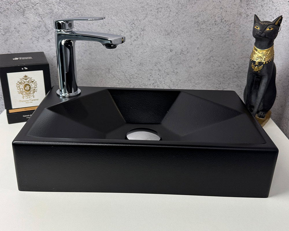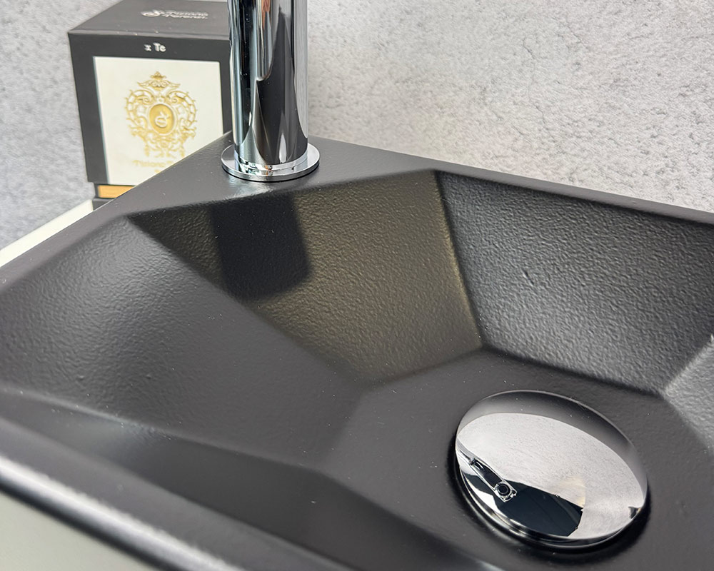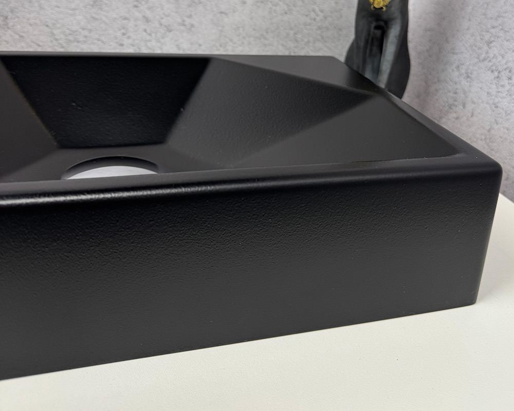 Колір умивальника-матовий чорний. Зовнішня поверхня має злегка шорстку, текстуровану або кам'яну фактуру, що додає кольору глибини, на відміну від гладкої кераміки.
