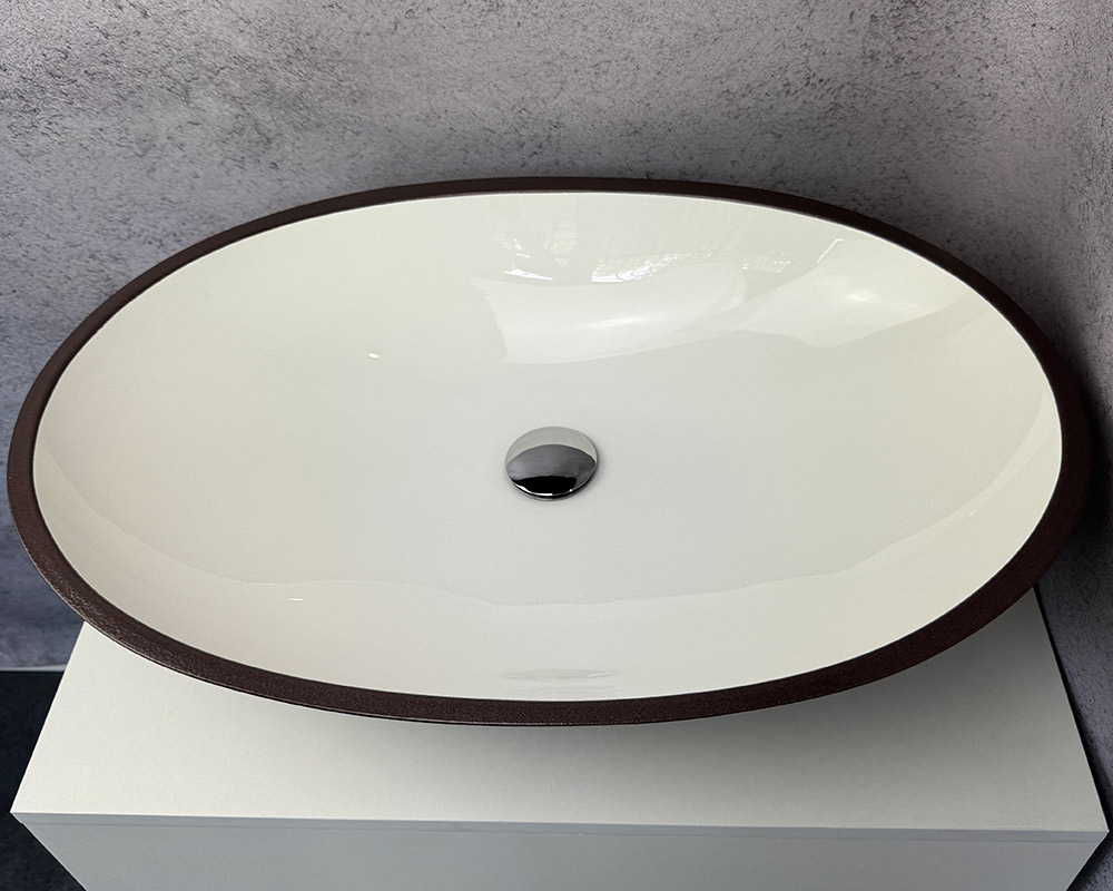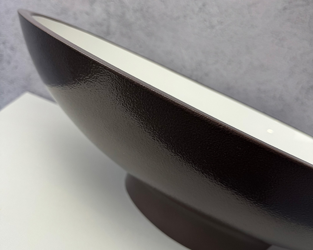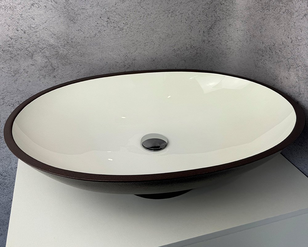 Цей умивальник має двоколірний дизайн: його зовнішня частина — це насичений темно-коричневий колір з матовою текстурою шагрень. Ця текстура надає йому цікавого рельєфу та стриманого, елегантного вигляду, а внутрішня частина — гладкий, глянцевий білий колір, що створює яскравий контраст з темною зовнішньою стороною.