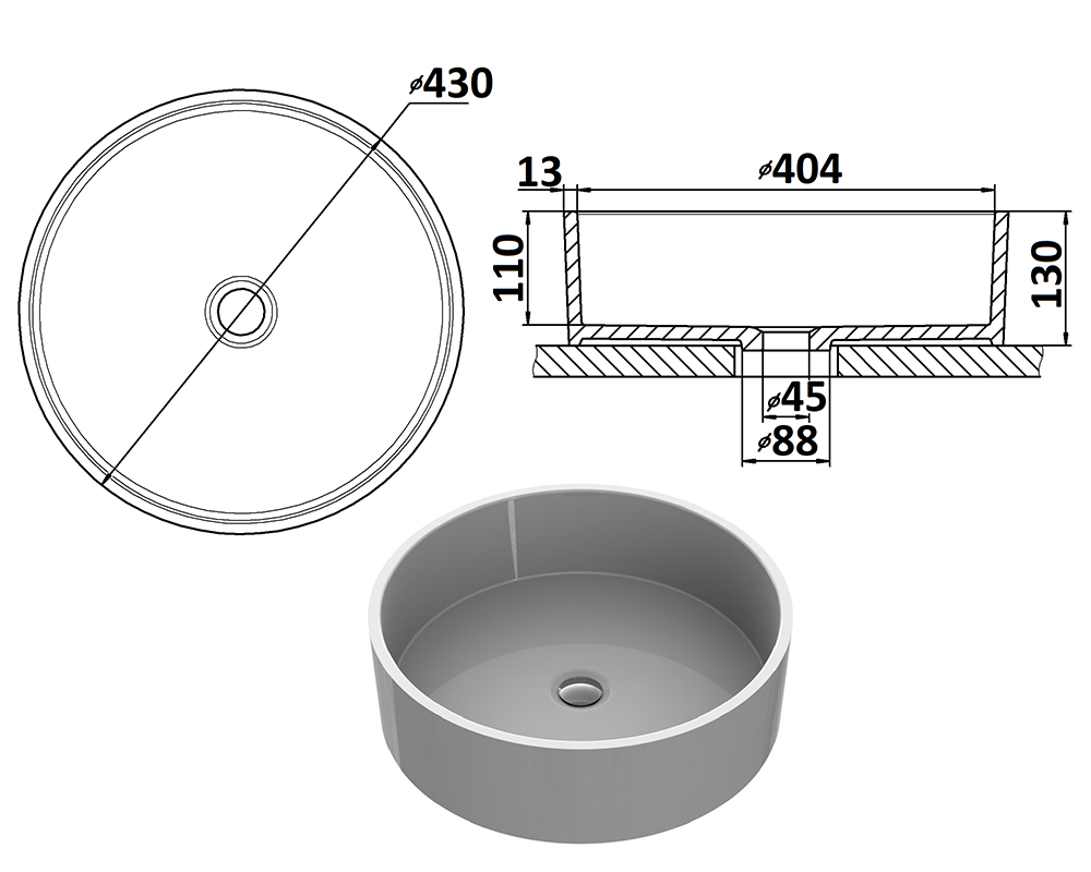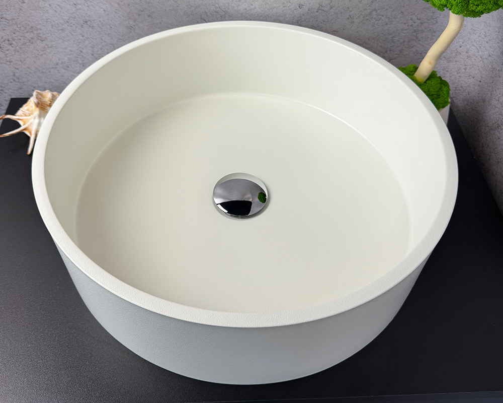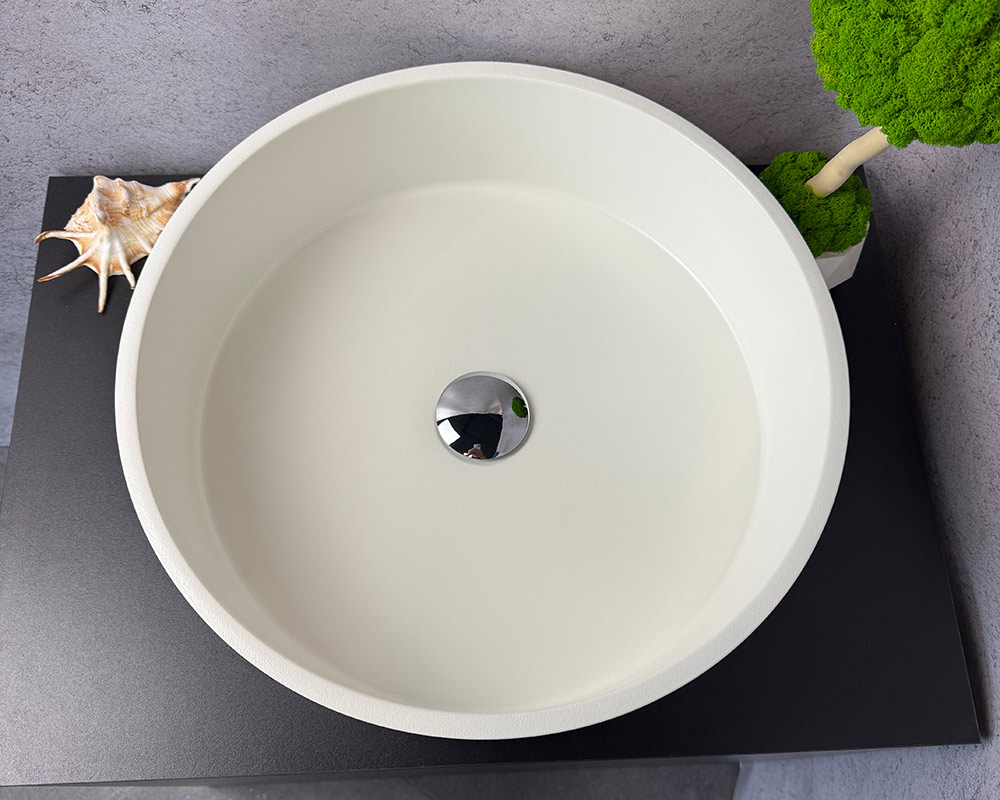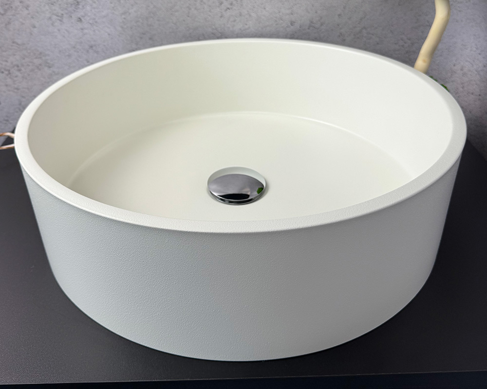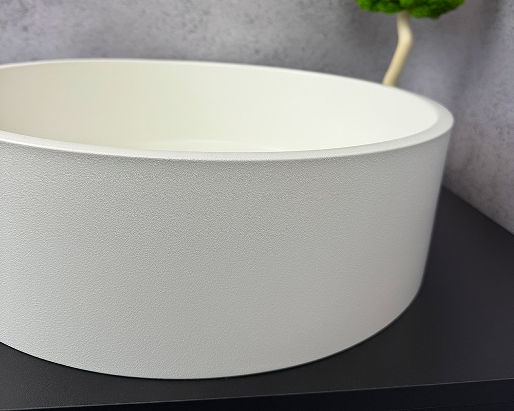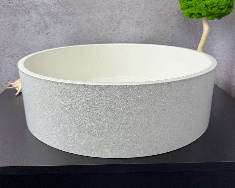 Колір умивальника-білий. Його ключова особливість — це текстура шагрень (дрібнозерниста, схожа на "апельсинову кірку"), якою вкрита зовнішня поверхня. Ця фактура надає білому кольору глибини і створює сучасний, тактильний, матовий фініш.