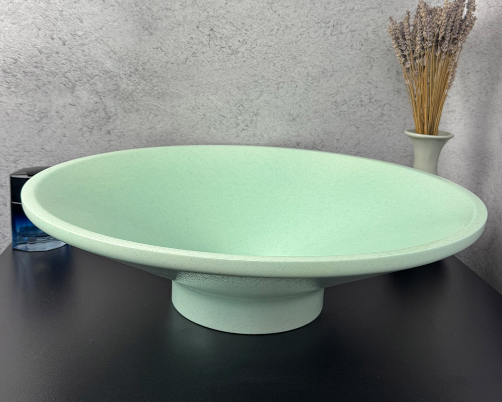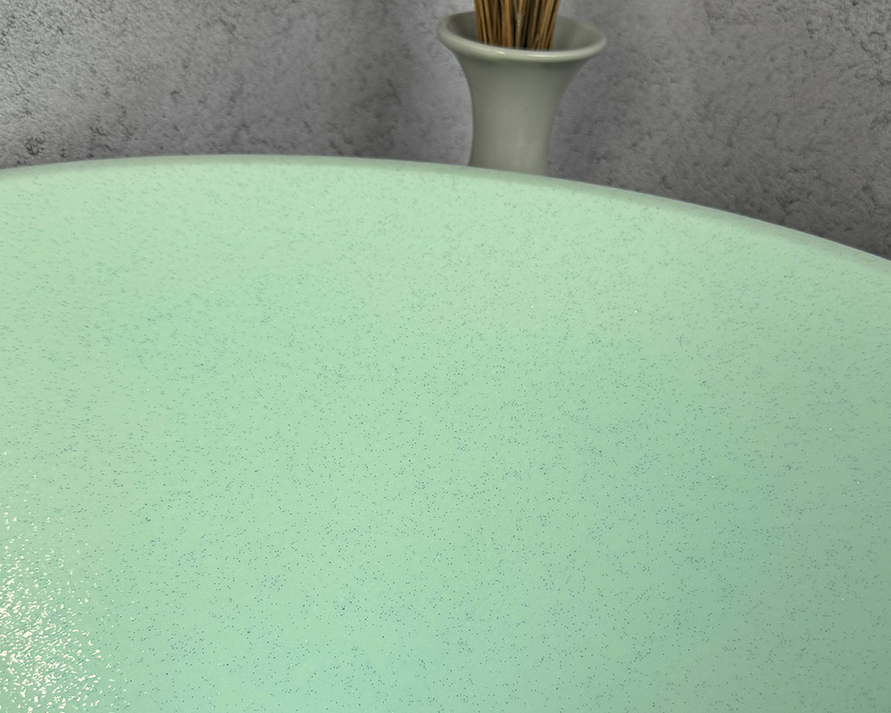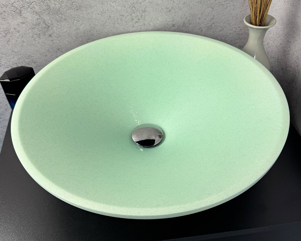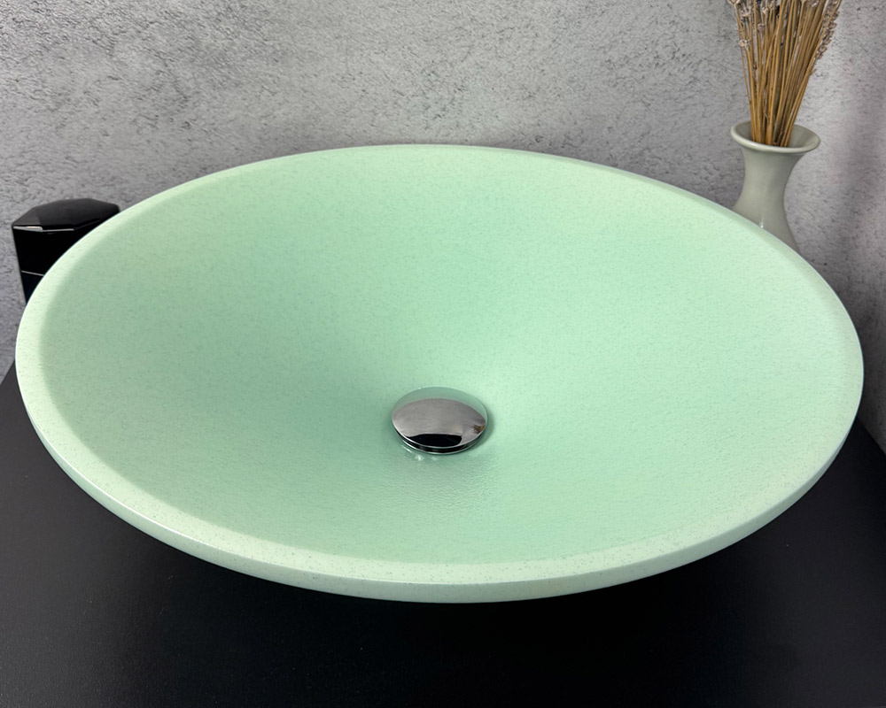 Цей умивальник має ніжний і свіжий м'ятний відтінок, це м'який, пастельний колір, який створює відчуття чистоти, спокою та легкості. Завдяки такому кольору умивальник може стати яскравим, але не надто нав'язливим акцентом у ванній кімнаті. Щодо текстури-шагрені: вона виглядає як поверхня з дрібними, рівномірно розподіленими крапками або вкрапленнями, що створює ефект легкого глітеру або дрібної крихти. Ця текстура надає умивальнику не лише візуальну, але й тактильну цікавість, роблячи його поверхню не абсолютно гладкою, а трохи шорсткою на вигляд.