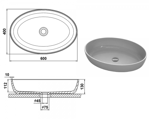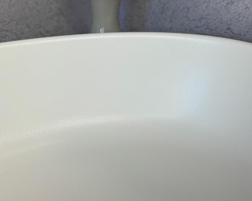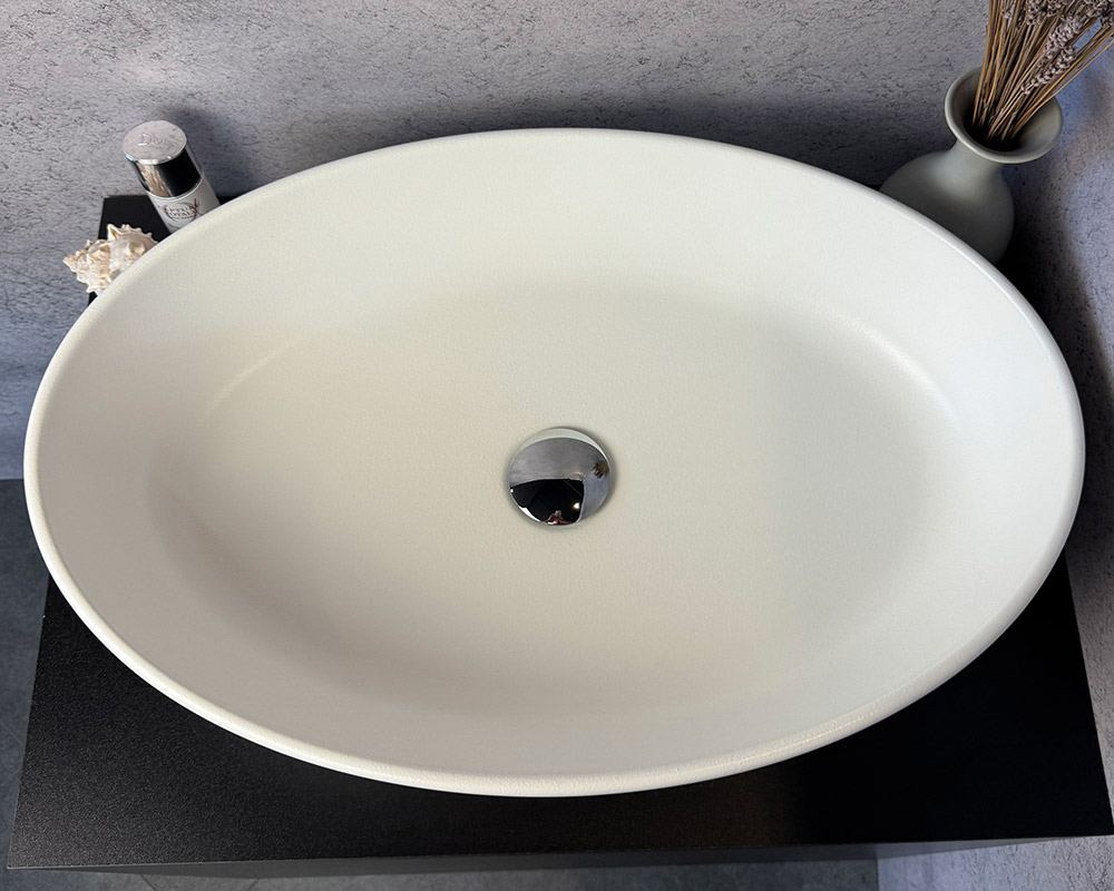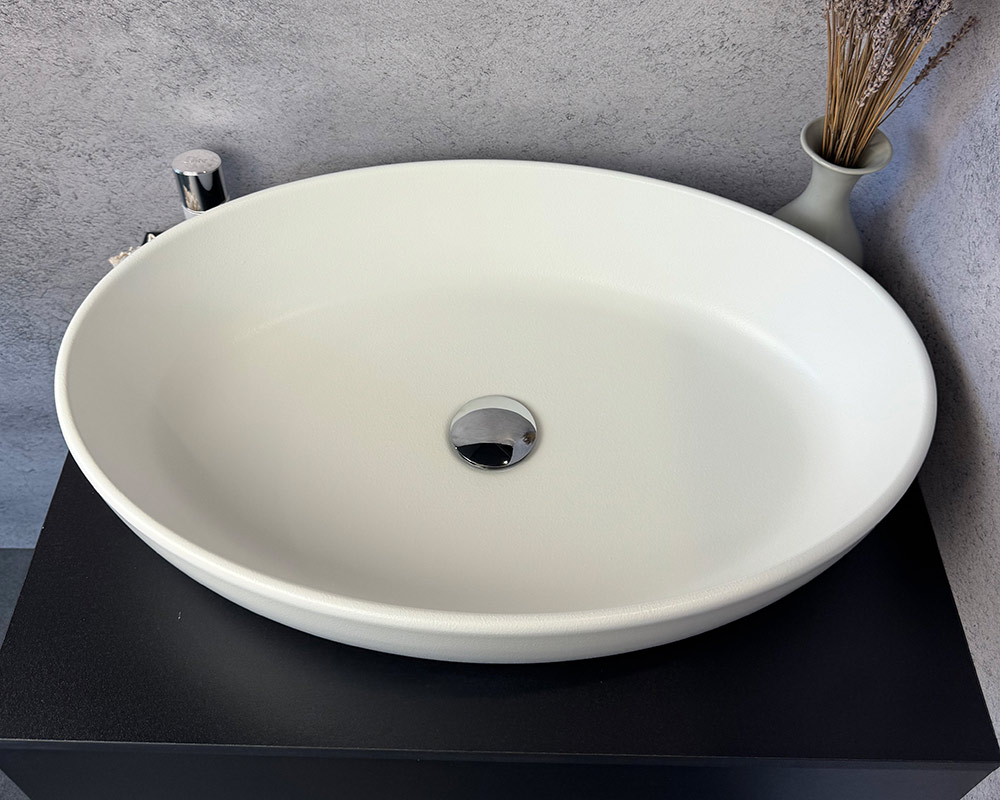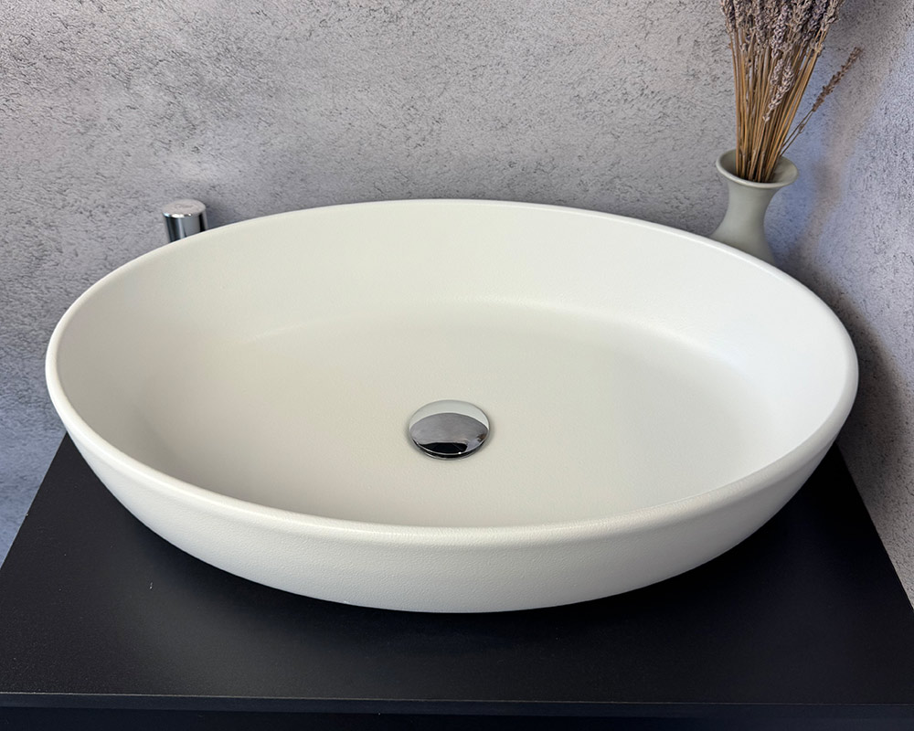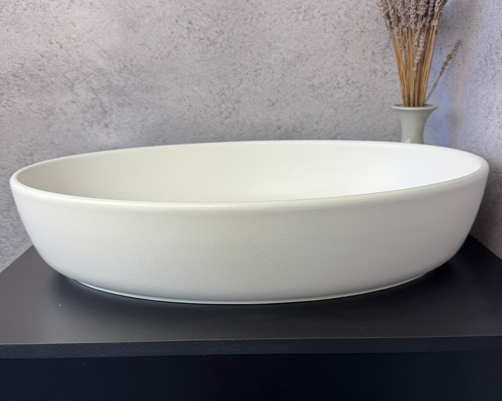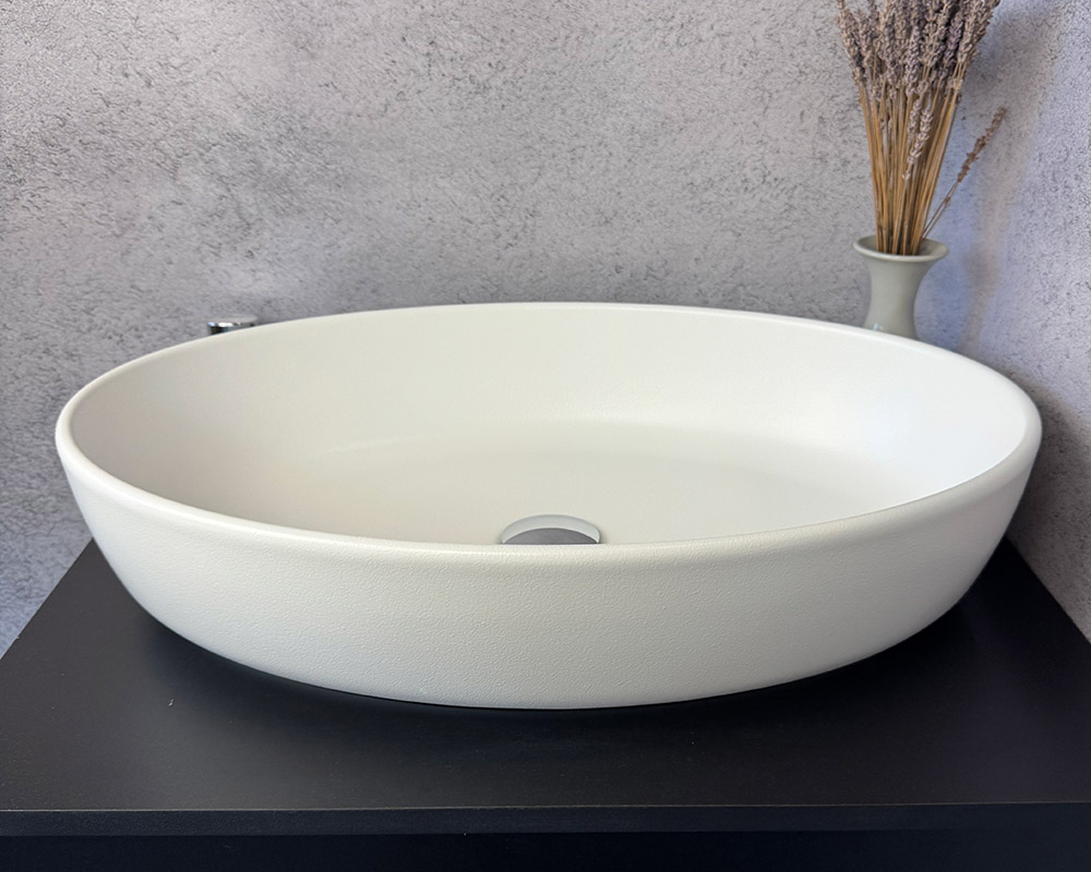 Умивальник виконаний у класичному білому кольорі, що підкреслює його чистоту, свіжість і універсальність. Поверхня має текстуру «шагрень» — дрібнозернисту матову фактуру, яка додає виробу стильності та практичності: на такому покритті менш помітні краплі води й сліди від використання.