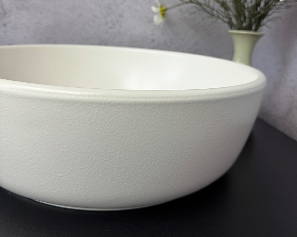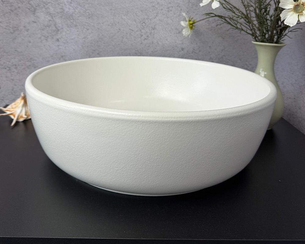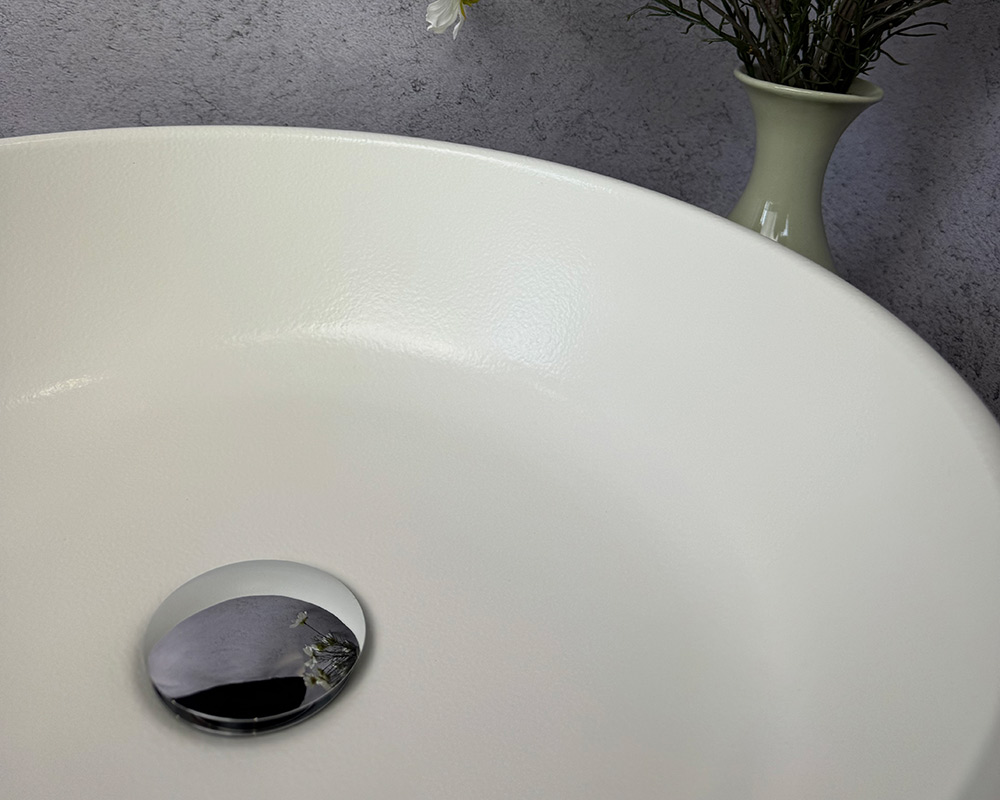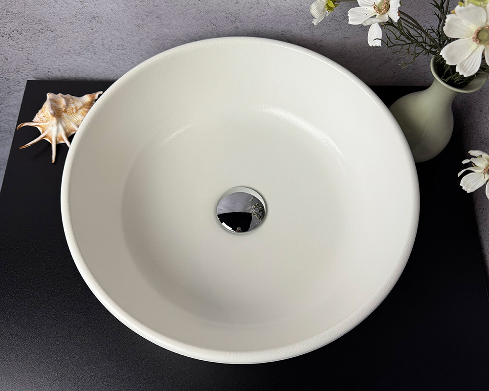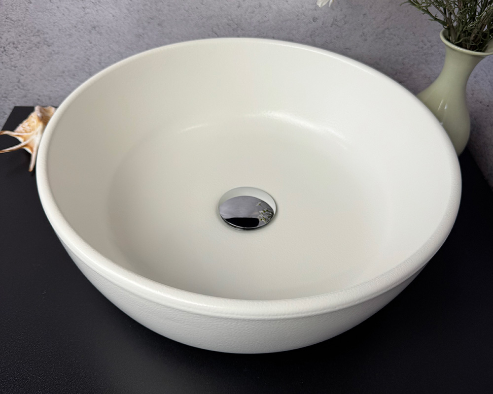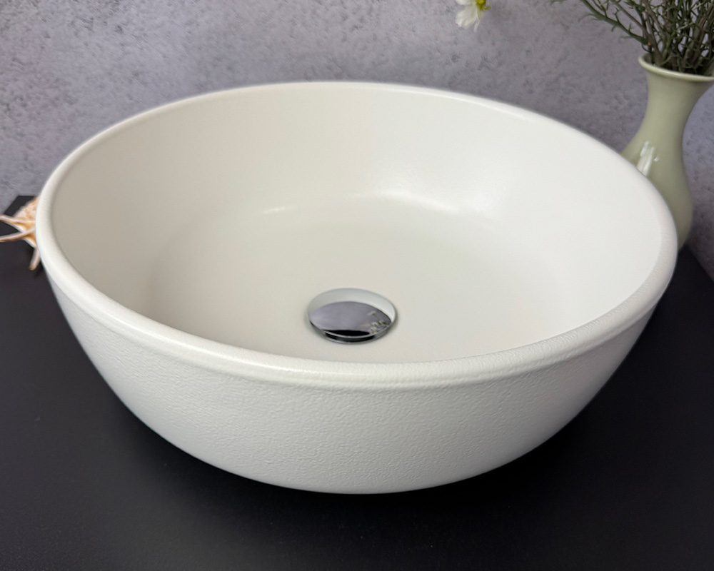 Умивальник має білий колір. Внутрішня i зовнішня поверхня мають виражену зернисту або шорстку текстуру, що додає кольору глибини і приглушує будь-який блиск.
