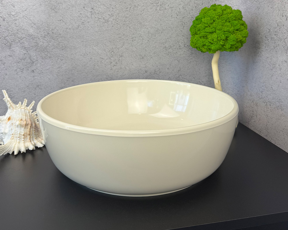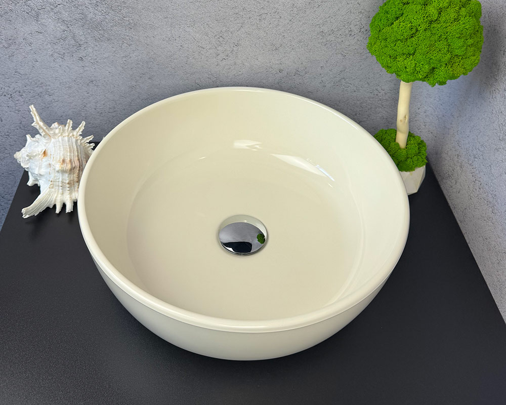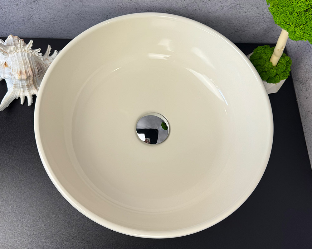 Умивальник має ніжний світло-бежевий колір із теплим відтінком айворі. Такий тон виглядає дуже м’яко й елегантно, надаючи виробу витонченого та універсального вигляду, який легко поєднується з різними інтер’єрними стилями. Поверхня гладка та глянцева, що підкреслює чистоту й акуратність форми.