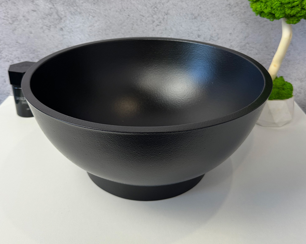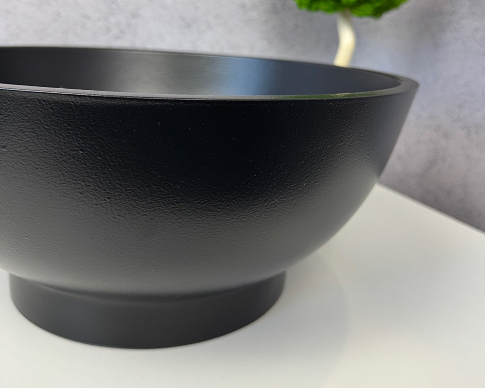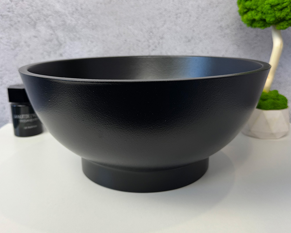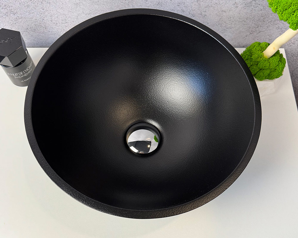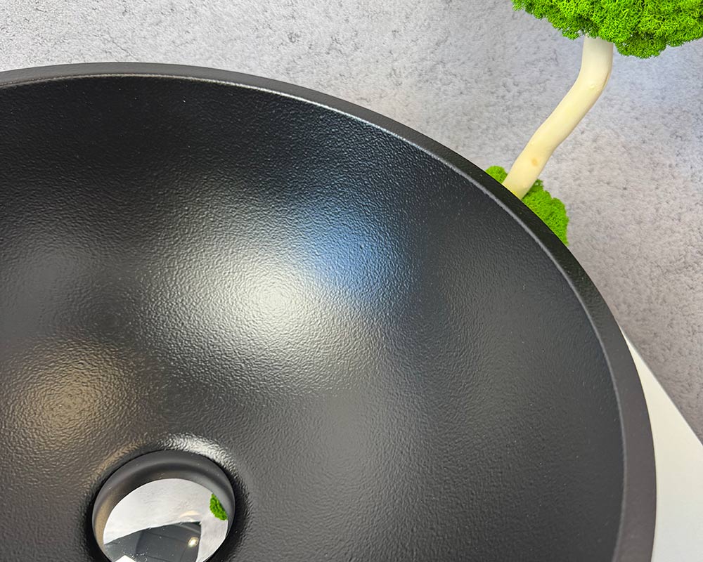 Умивальник має глибокий чорний колір, який виглядає вишукано та стримано. Поверхня виконана у текстурі шагрень — дрібнозерниста матова фактура з легким рельєфом, що надає виробу стильного характеру та практичності у використанні.