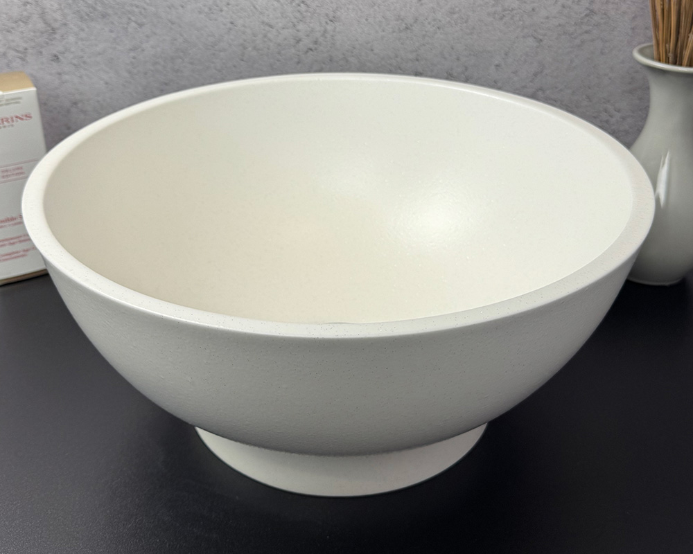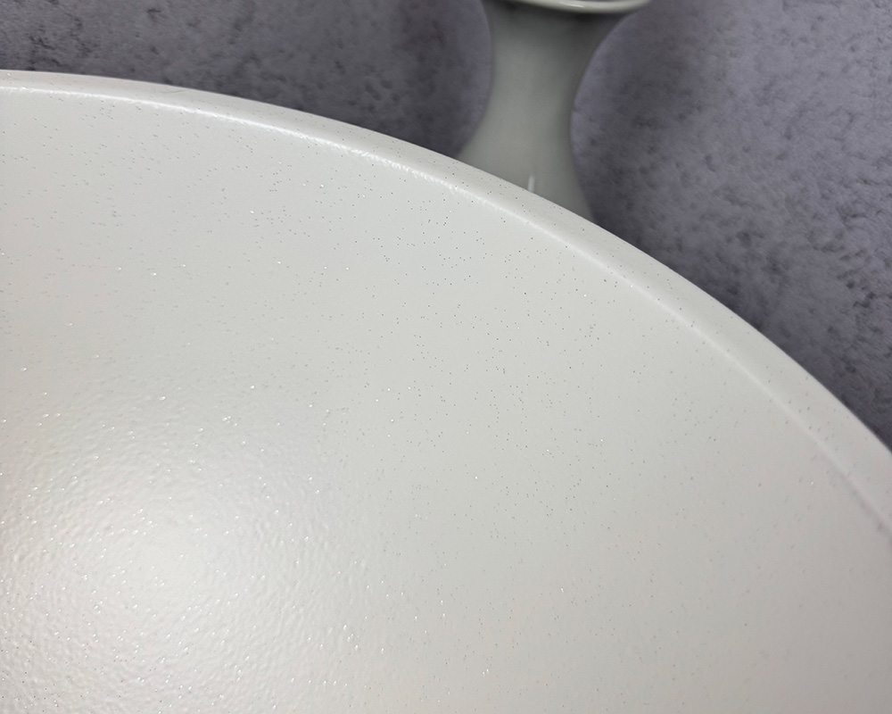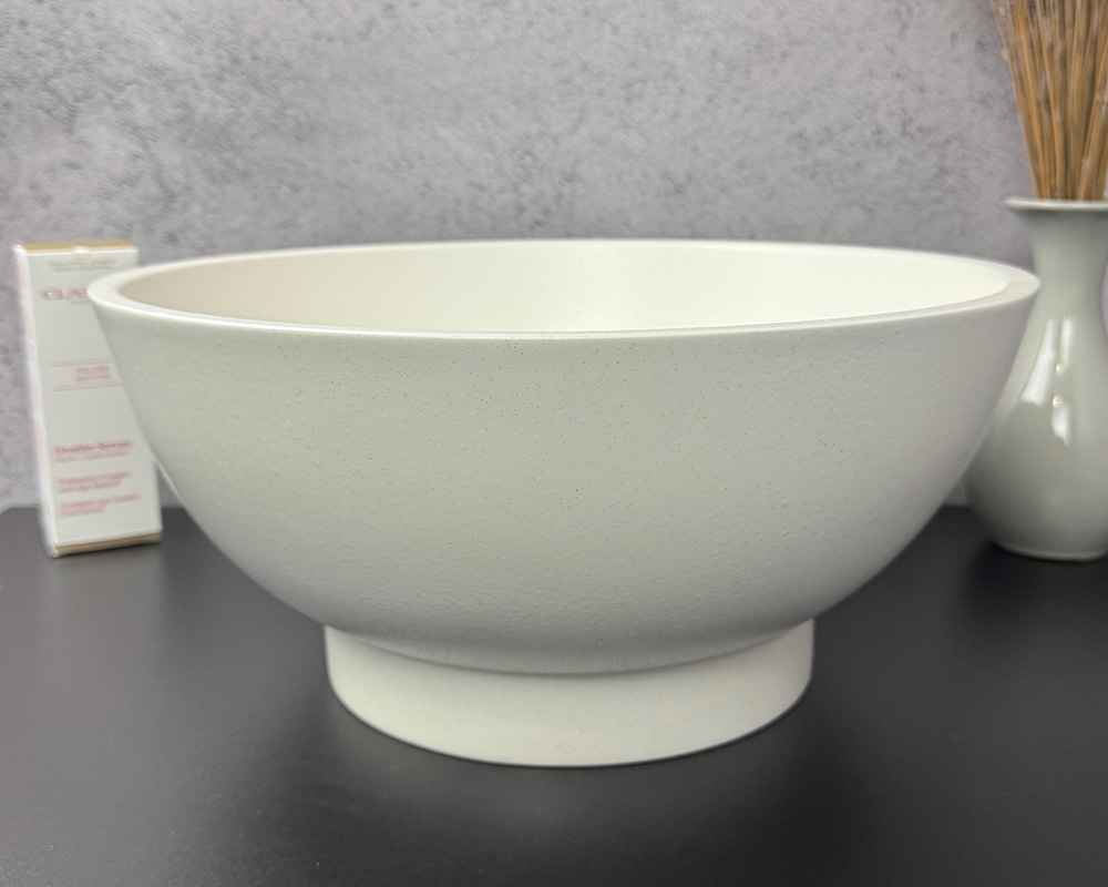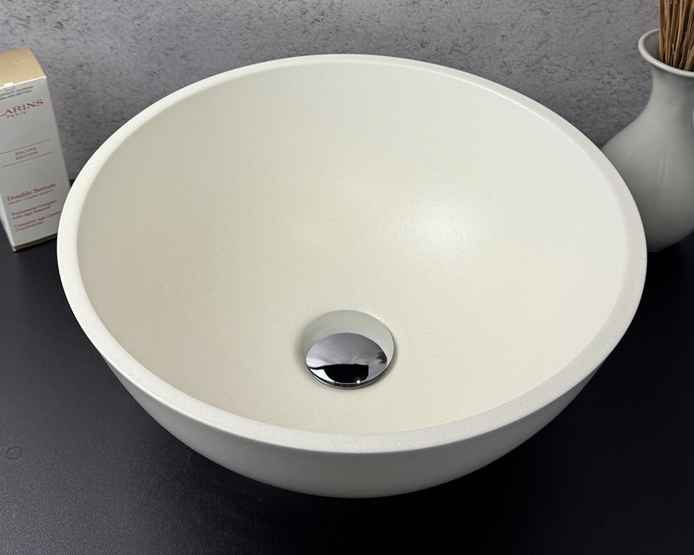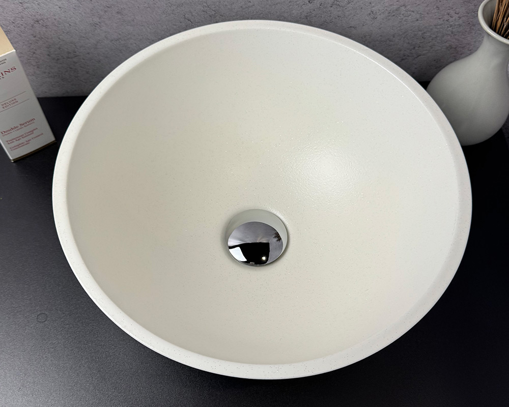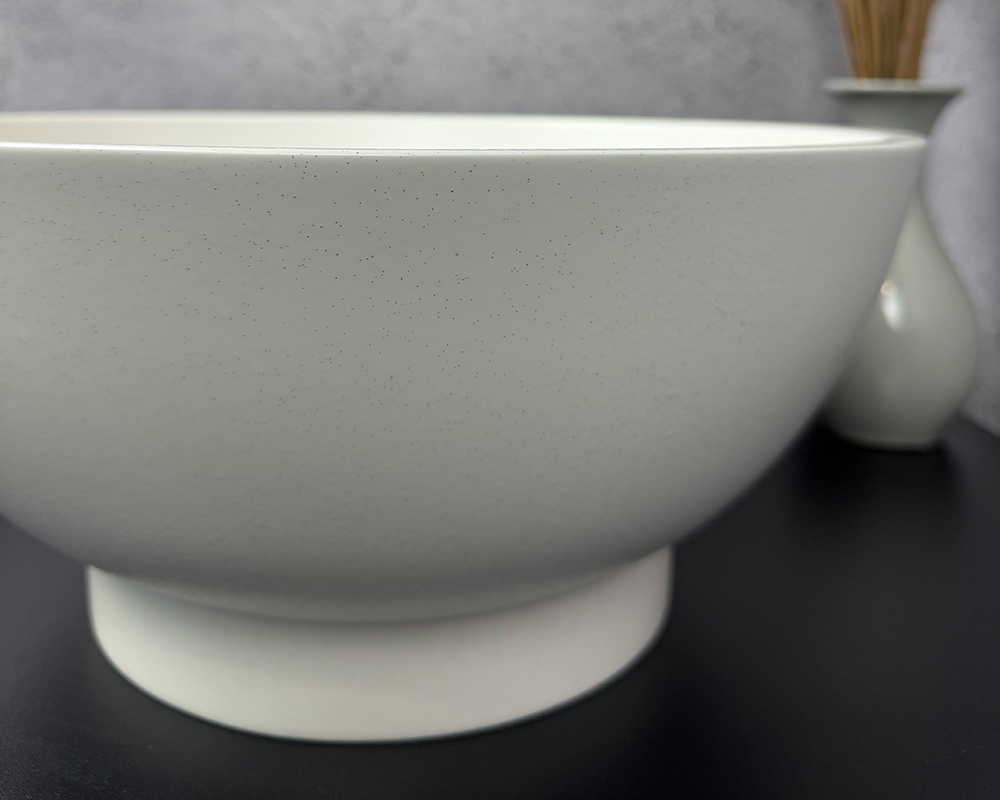 Цей умивальник має білий колір із ледь помітними темними крапками по всій поверхні. Така текстура створює ефект натурального каменю або кераміки з легким крапчастим малюнком. Загалом відтінок дуже нейтральний, сучасний і добре пасує до мінімалістичних інтер’єрів.
