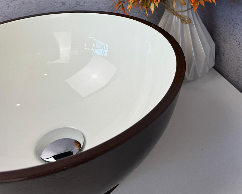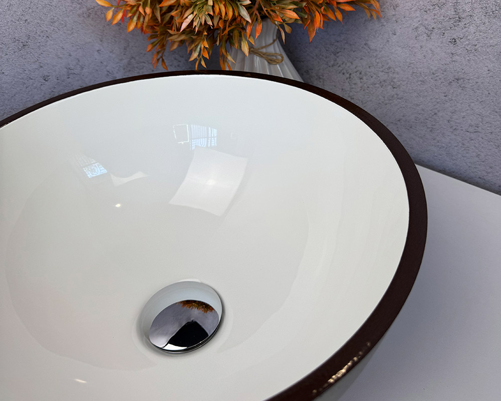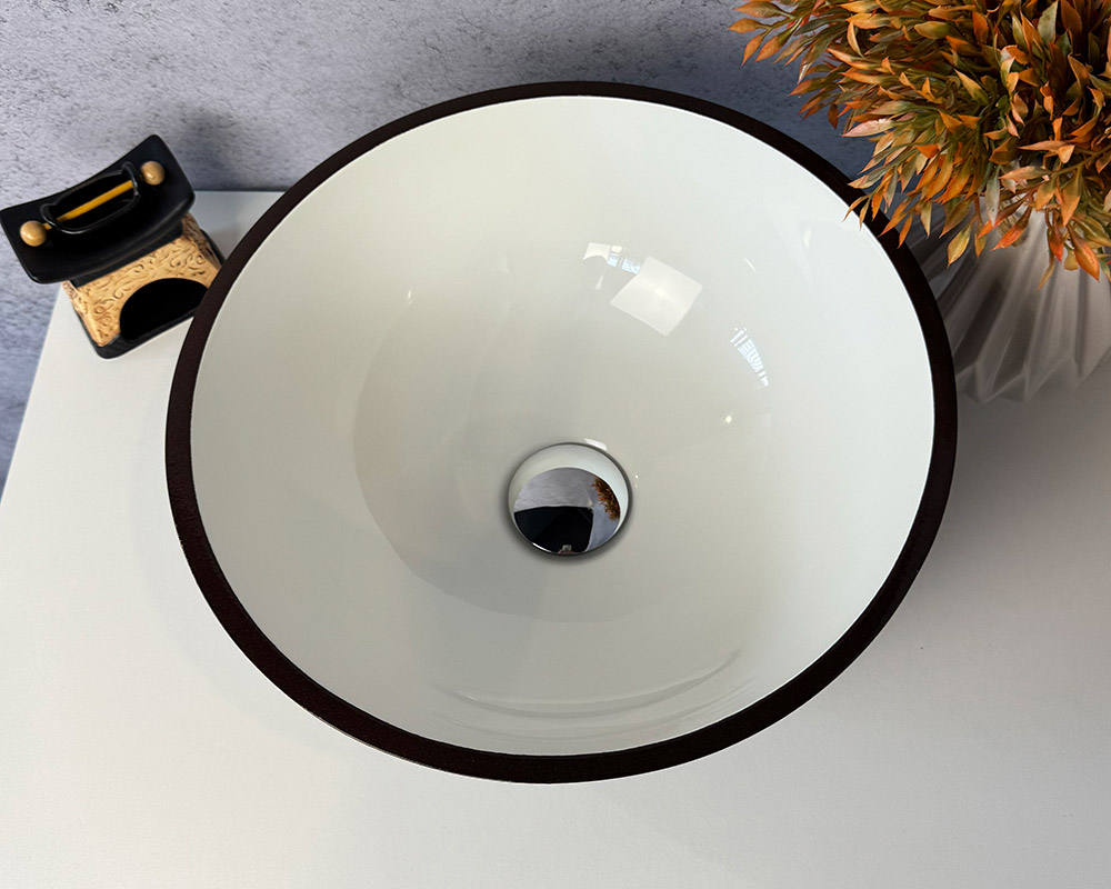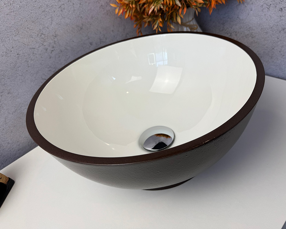 Умивальник має зовнішню поверхню та облямівку темно-коричневого кольору, а внутрішня частина – біла, глянцева. Такий контраст робить його стильним і сучасним.