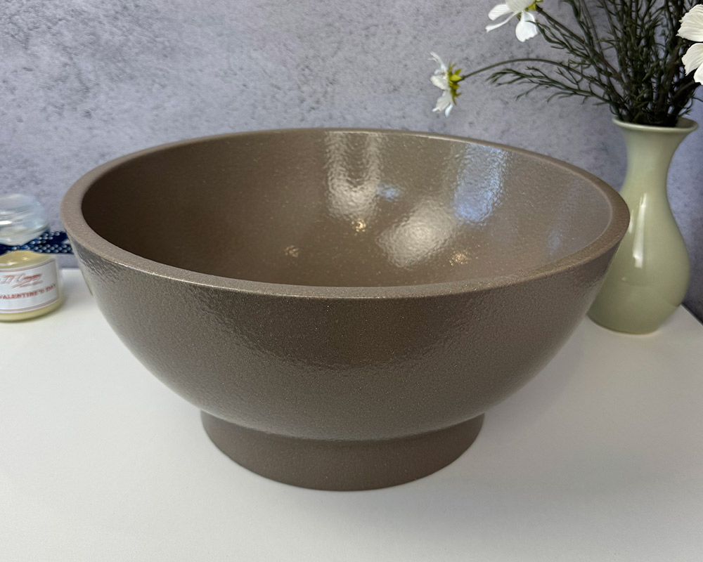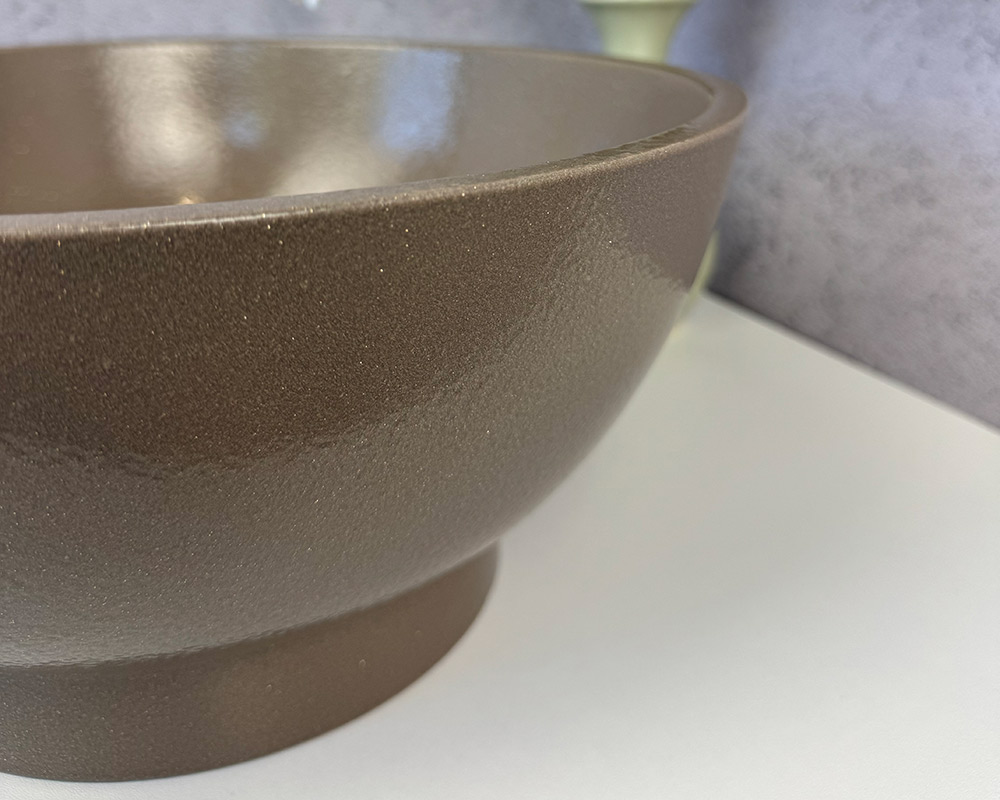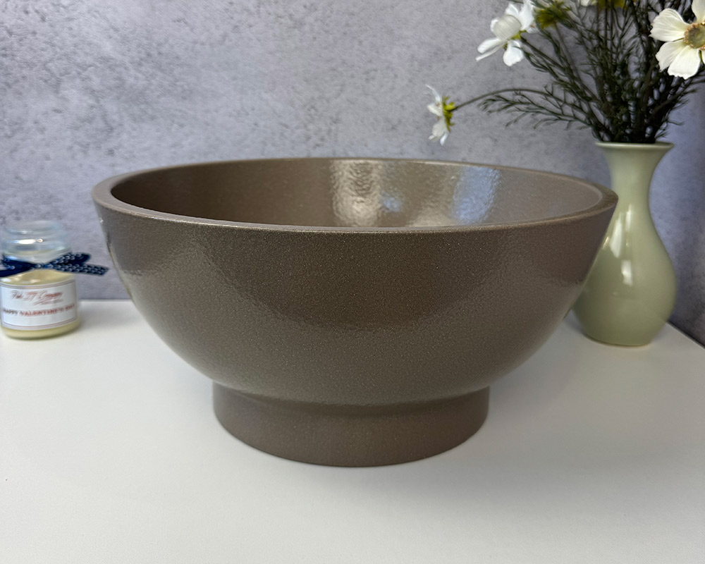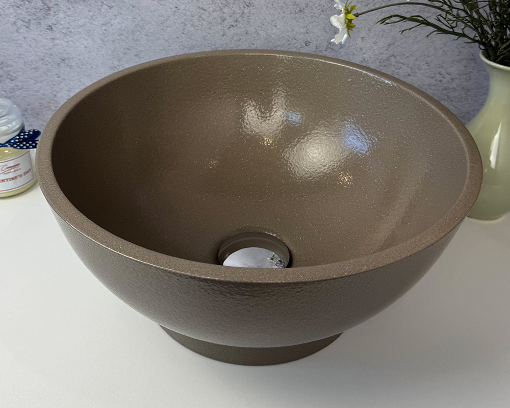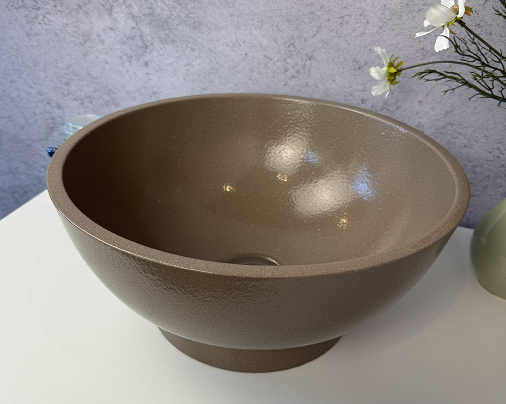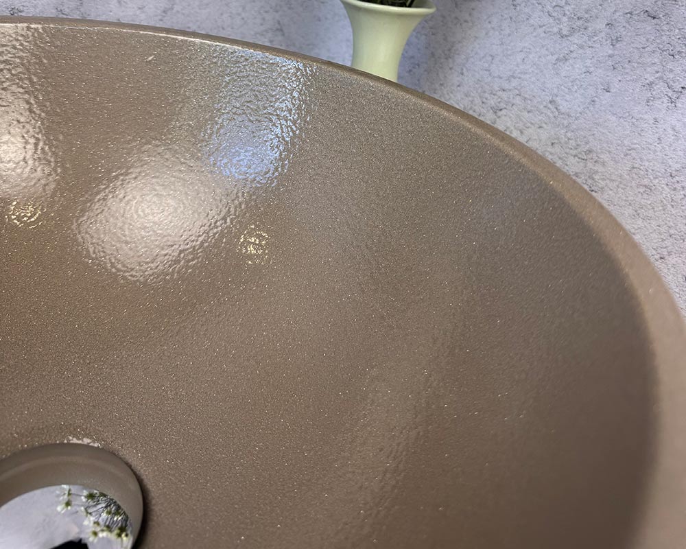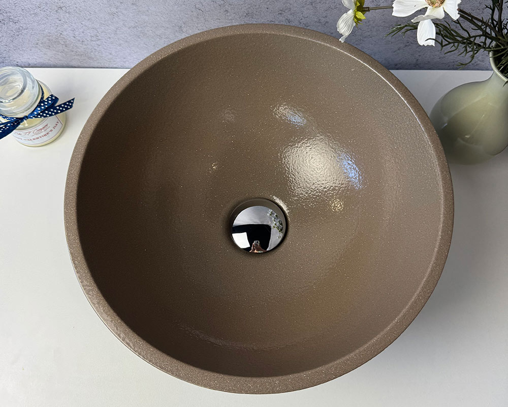 Умивальник має благородний відтінок теплого коричнево-бежевого кольору, який нагадує натуральний тон кави з молоком. Легка фактурність поверхні з ефектом «шагрень» додає глибини та витонченості, роблячи колір більш насиченим і виразним. Такий відтінок виглядає стримано, але водночас елегантно, гармонійно поєднуючись як із класичними, так і з сучасними інтер’єрними рішеннями.