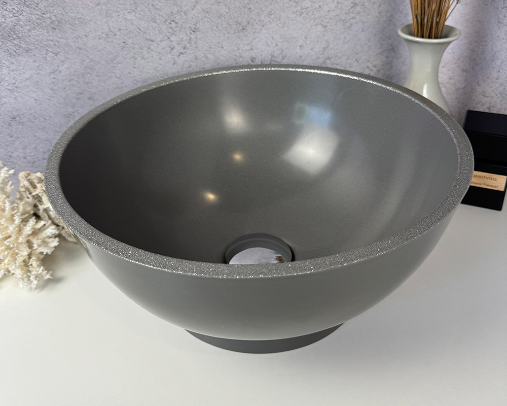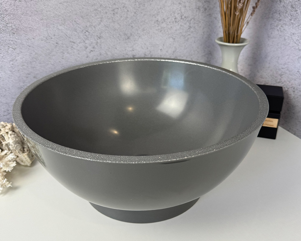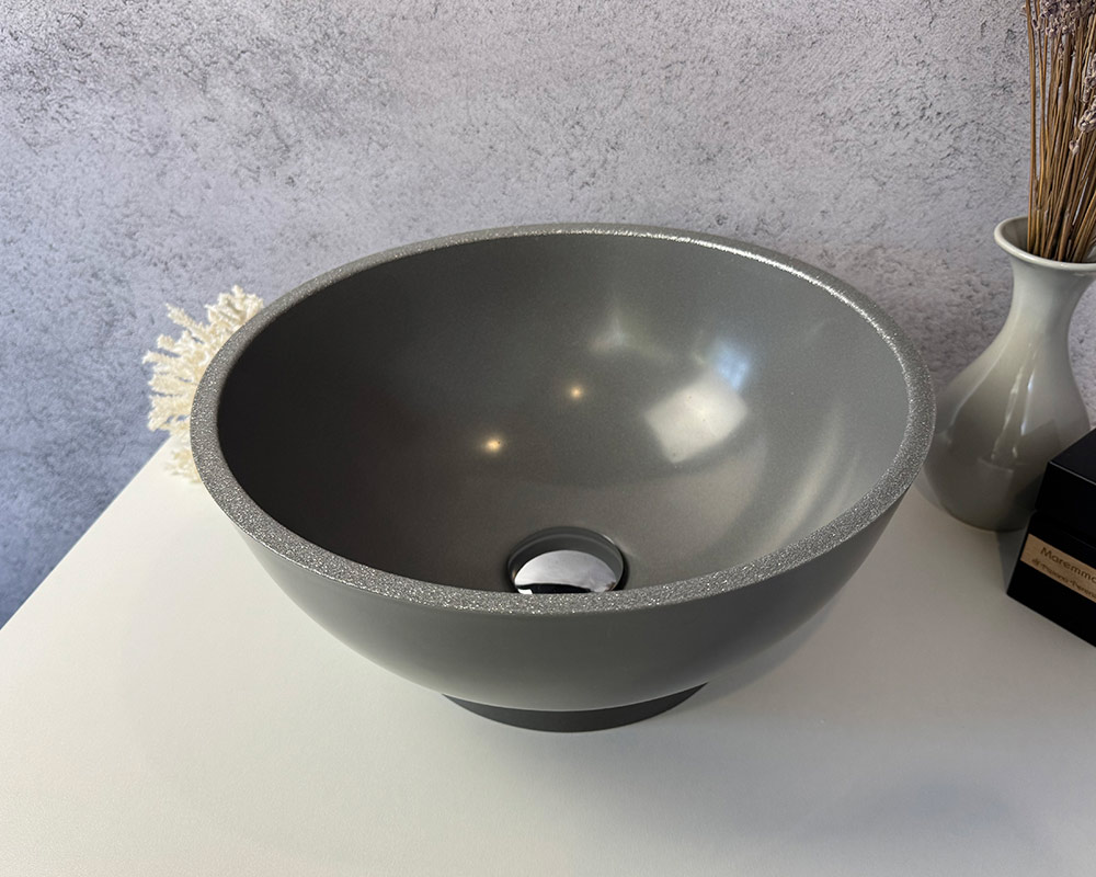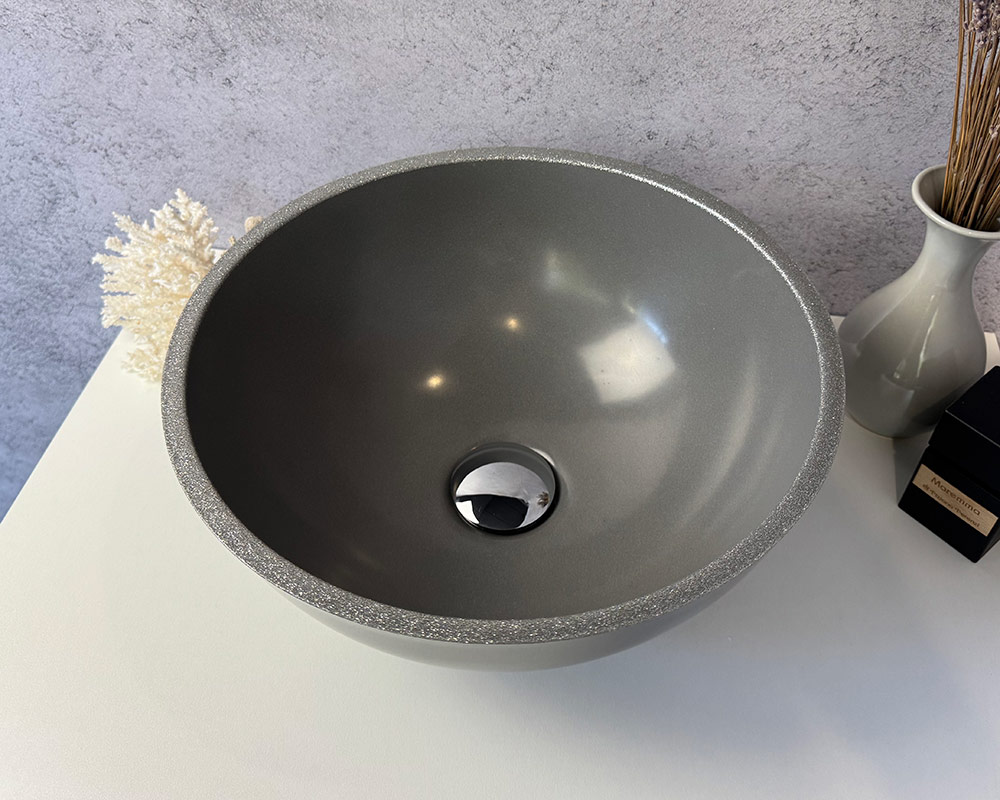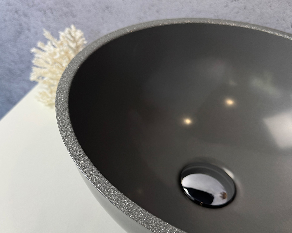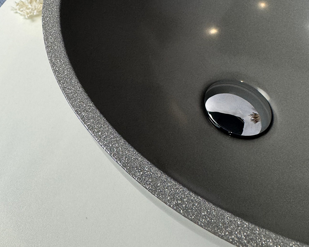 Умивальник має насичений, глибокий сірий колір, схожий на графітовий. Його зовнішній край оздоблений блискучою текстурою, що нагадує срібний або металік з глітером. Цей контраст створює цікавий візуальний ефект.