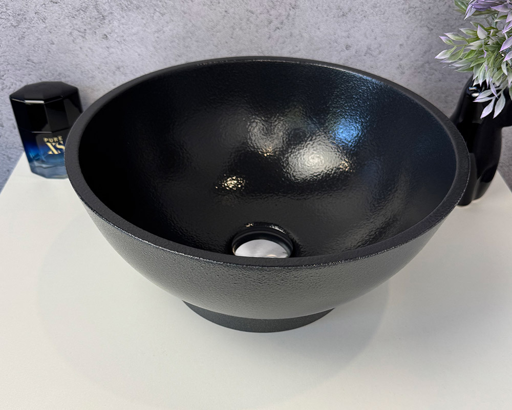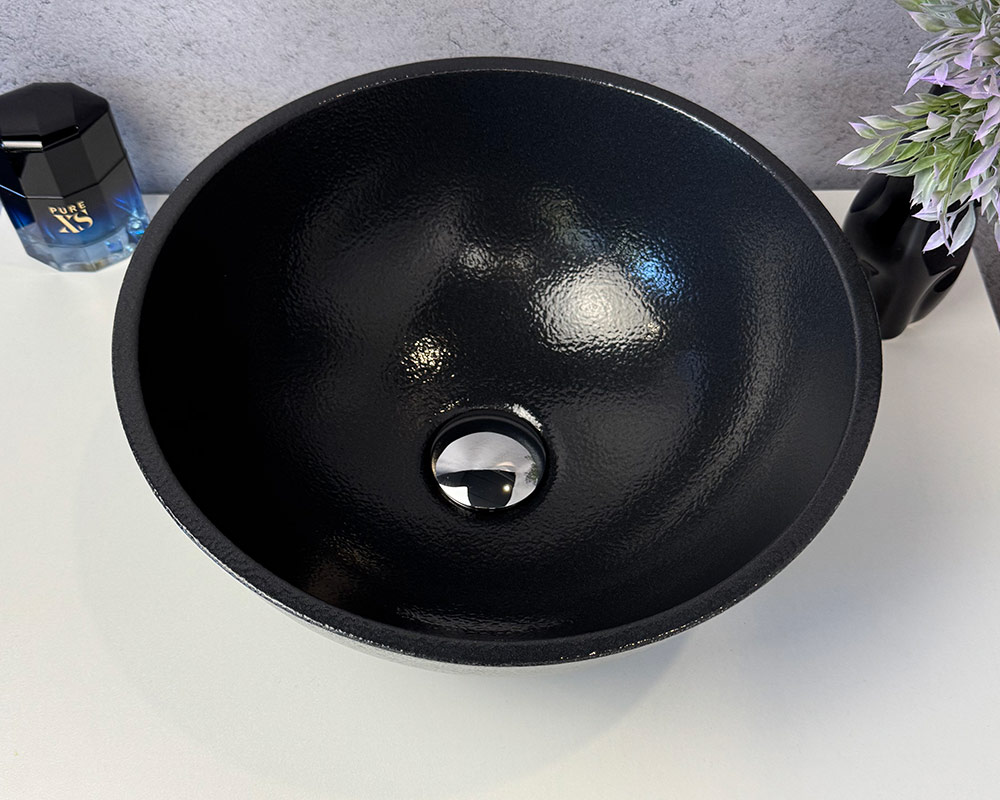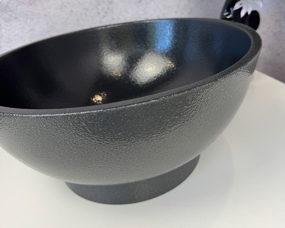 Зовнішня частина умивальника виконана у стриманому сірому кольорі з фактурою «шагрень», що додає поверхні легкого рельєфу та матової елегантності. Внутрішня чаша має глибокий відтінок меланіту — насичений, майже чорний, виконаний з текстурою шагрень.