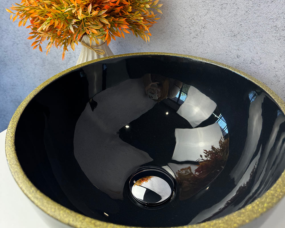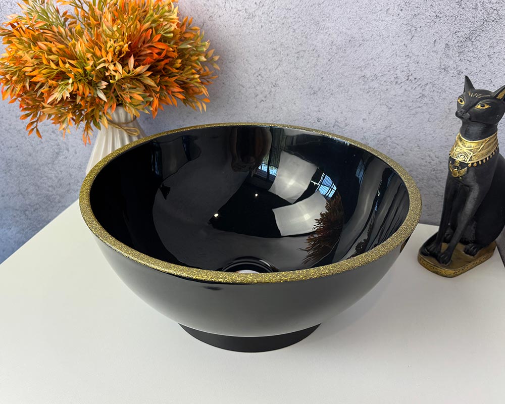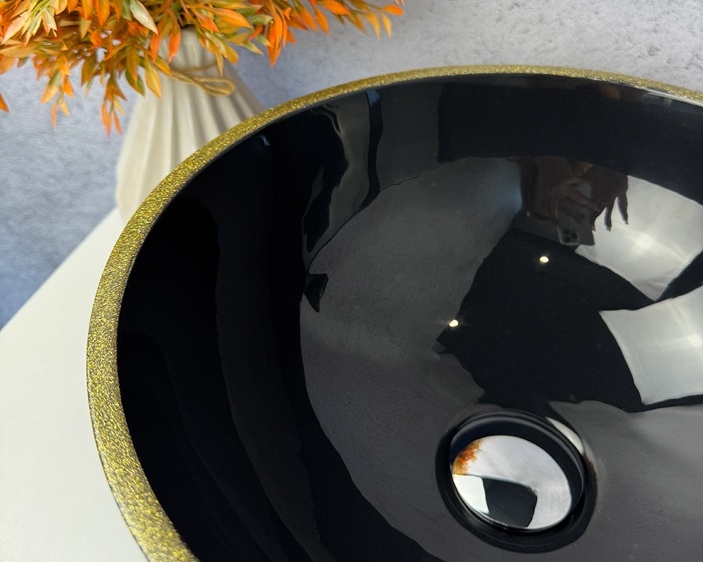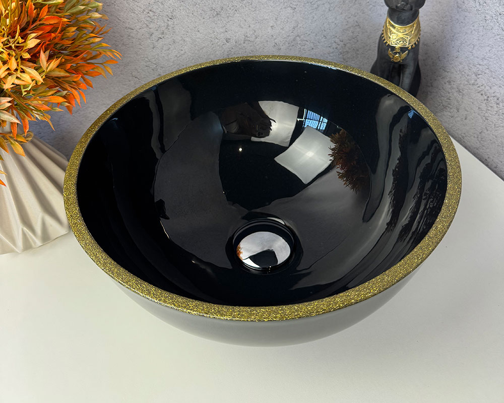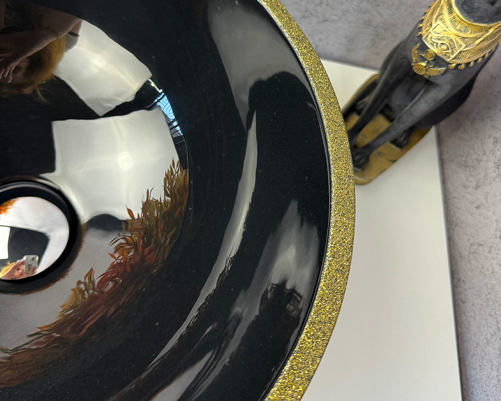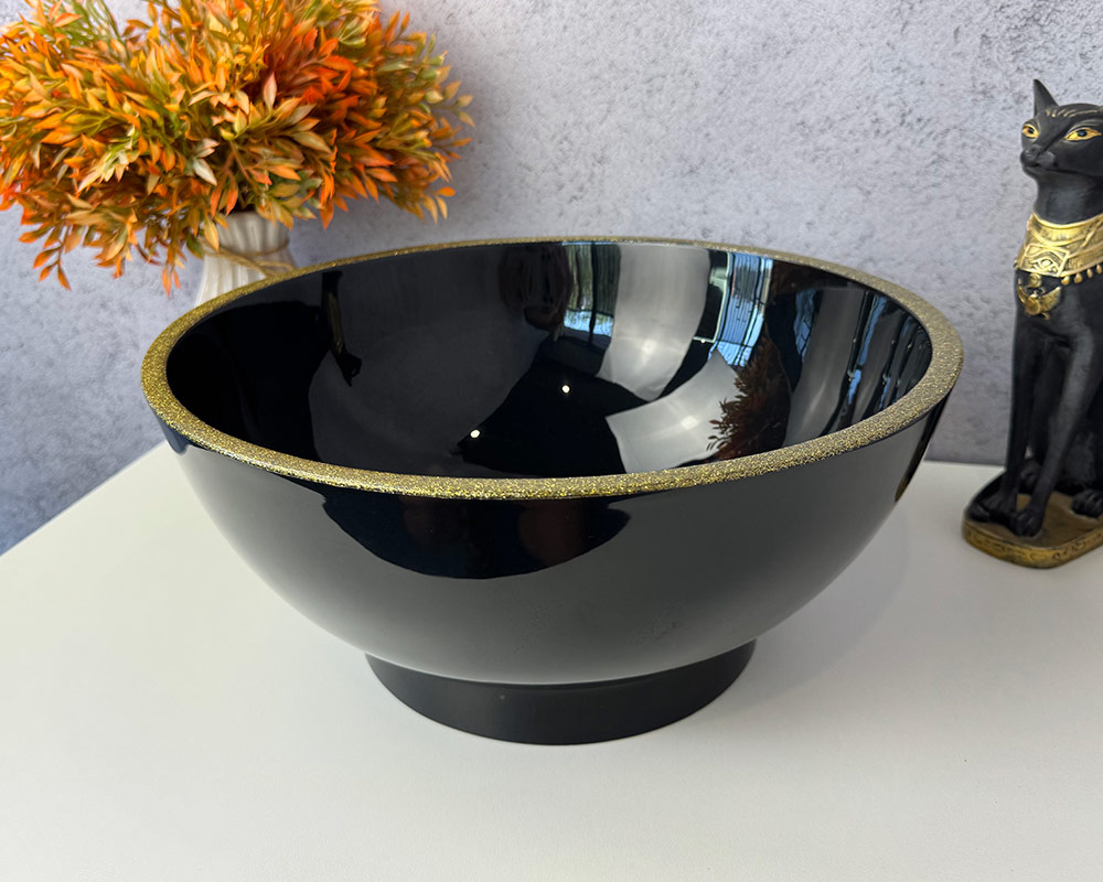 Умивальник виконаний у глибокому чорному кольорі як зовні, так і всередині, що створює ефект розкоші та вишуканості. Його глянсова поверхня красиво віддзеркалює світло, підкреслюючи елегантність форми. Особливого шарму додає витончена золота облямівка по краю, яка створює стильний контраст із чорним тоном і надає виробу благородного та преміального вигляду.
