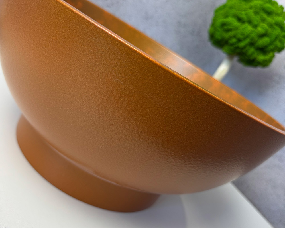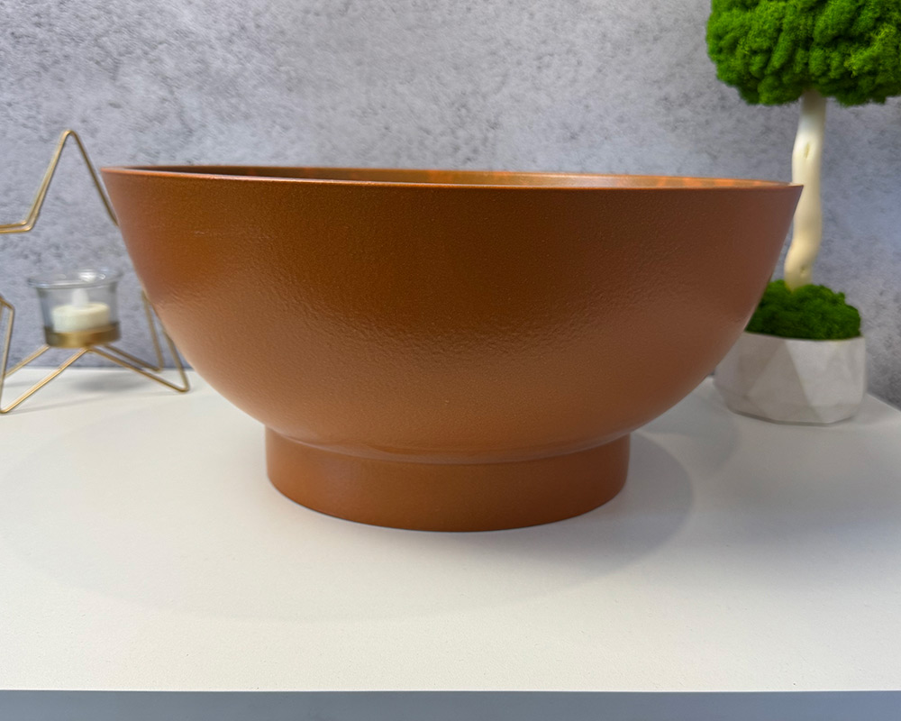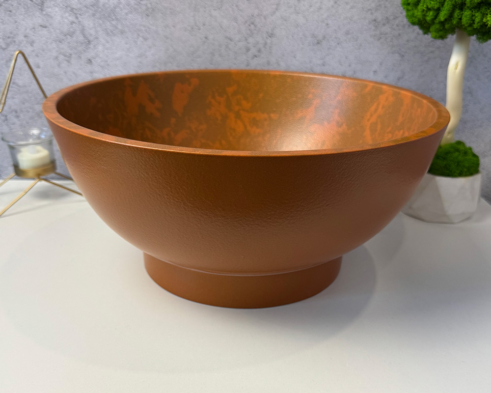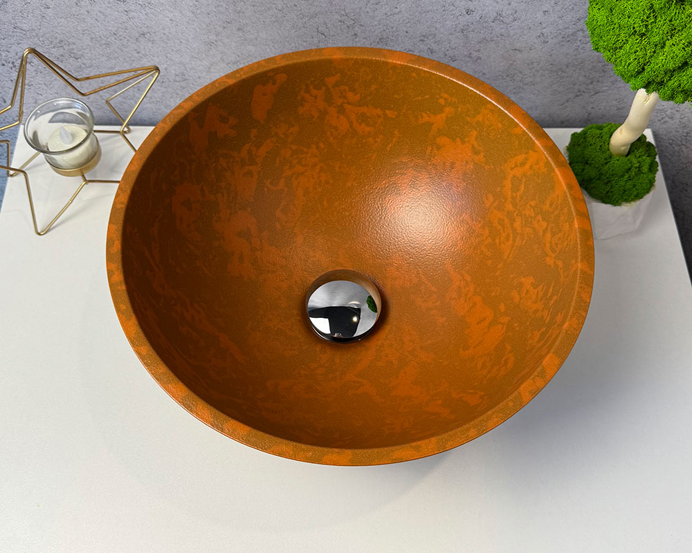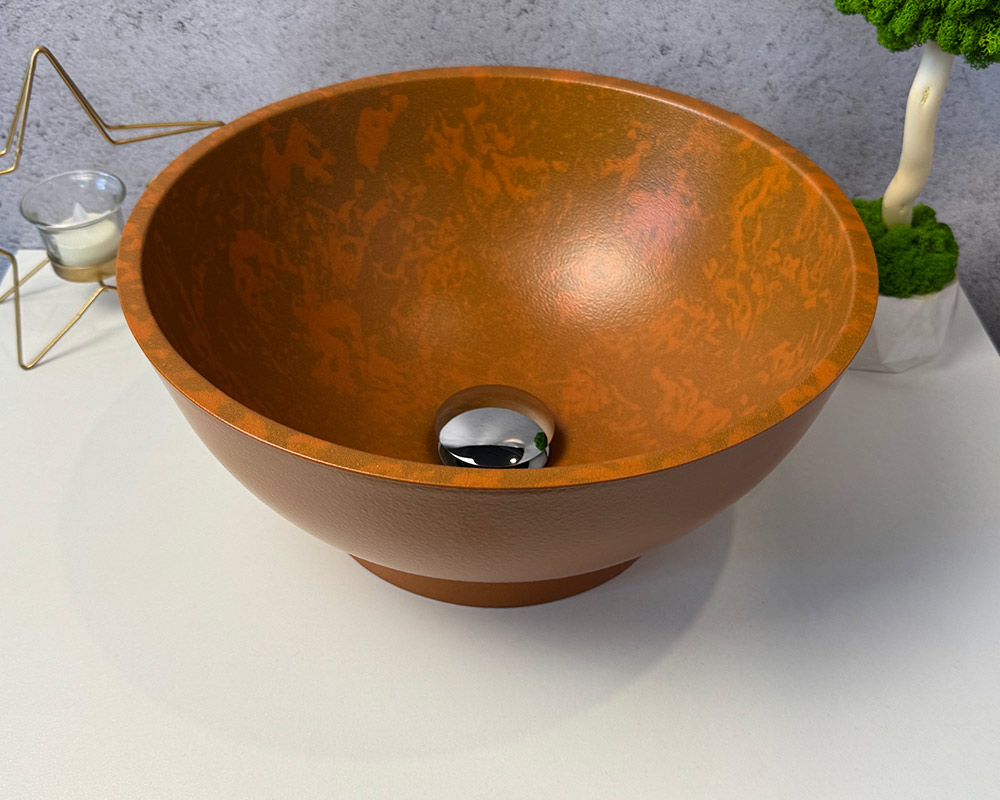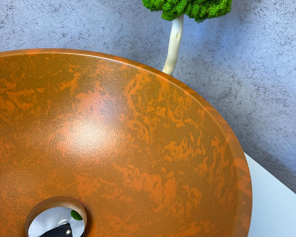 Зовнішня частина та основа умивальника мають насичений, глибокий теракотовий колір. Внутрішня чаша має мармуровий або плямистий/камуфляжний малюнок. Цей малюнок складається з яскравих, золотисто-рудих або мідних плям/розводів, які створюють ефект окисленого металу або натурального каменю. Зовнішня та внутрішня поверхня напівматова і має дрібнозернисту, трохи шорстку текстуру-шагрень.