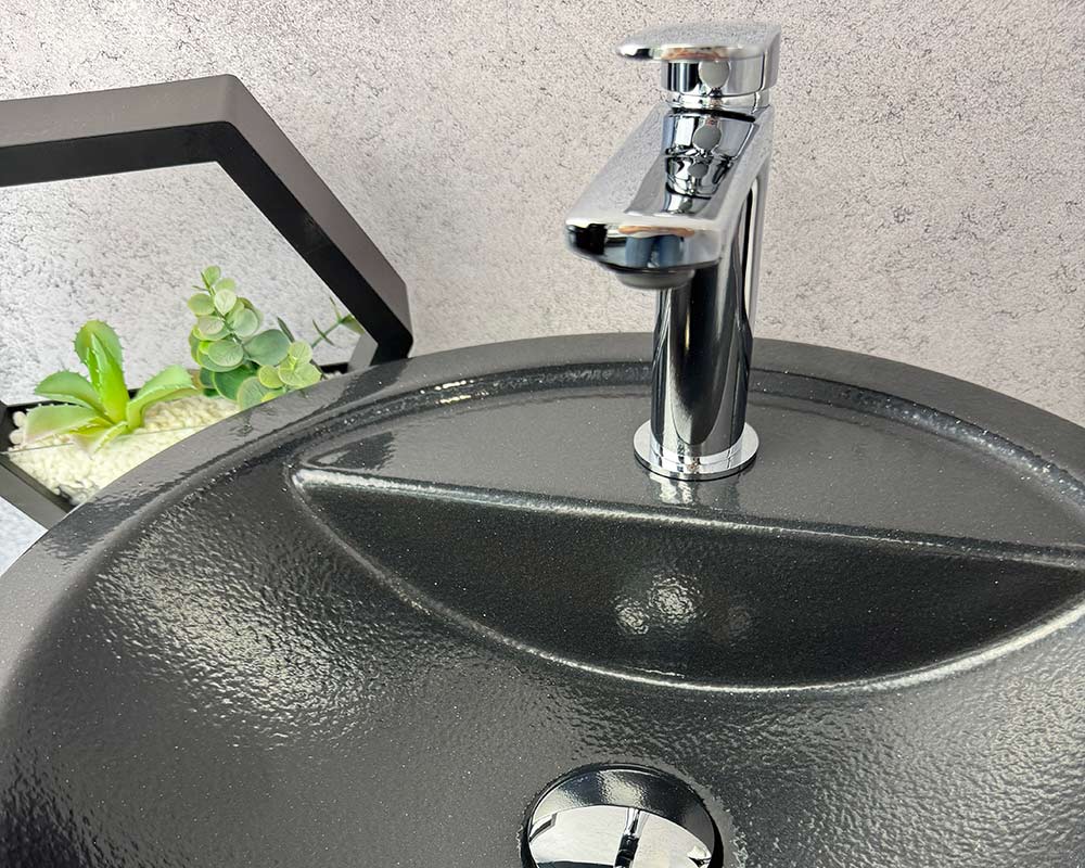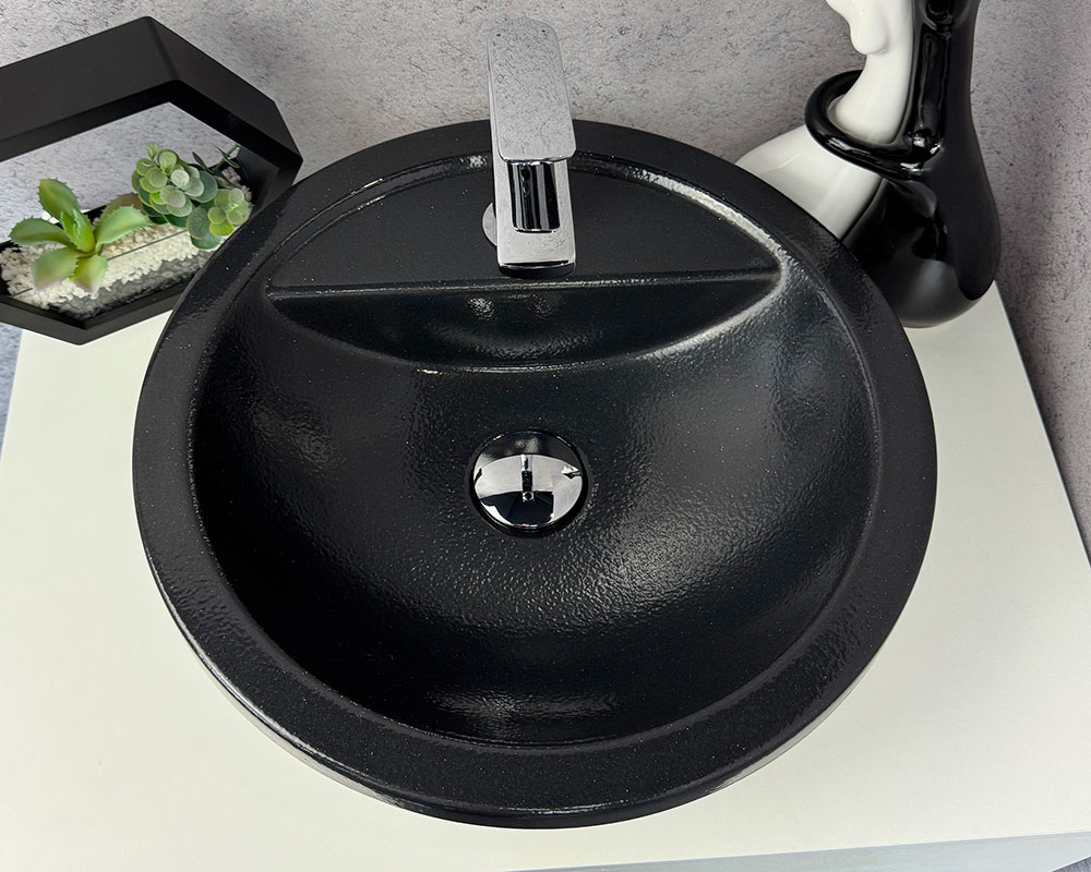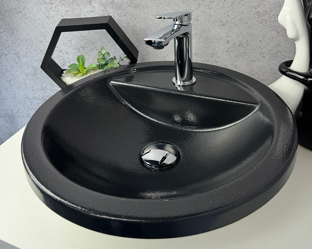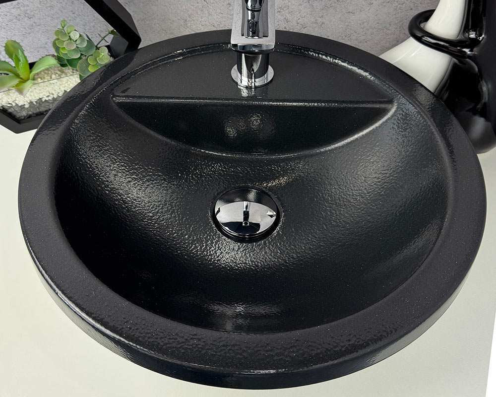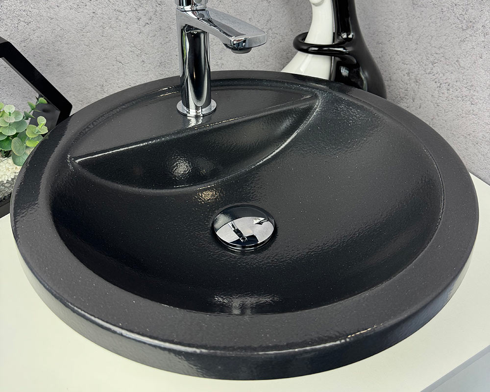 Цей умивальник має глибокий і бездоганний чорний колір, що нагадує обсидіан або чорну каву. Його поверхня не просто матова, а має виразну шагреневу текстуру, яка створює ефект легкої шорсткості. Ця особливість надає умивальнику не лише візуальної глибини, але й відчуття тактильного комфорту, роблячи його стильним і практичним елементом сучасного інтер'єру.