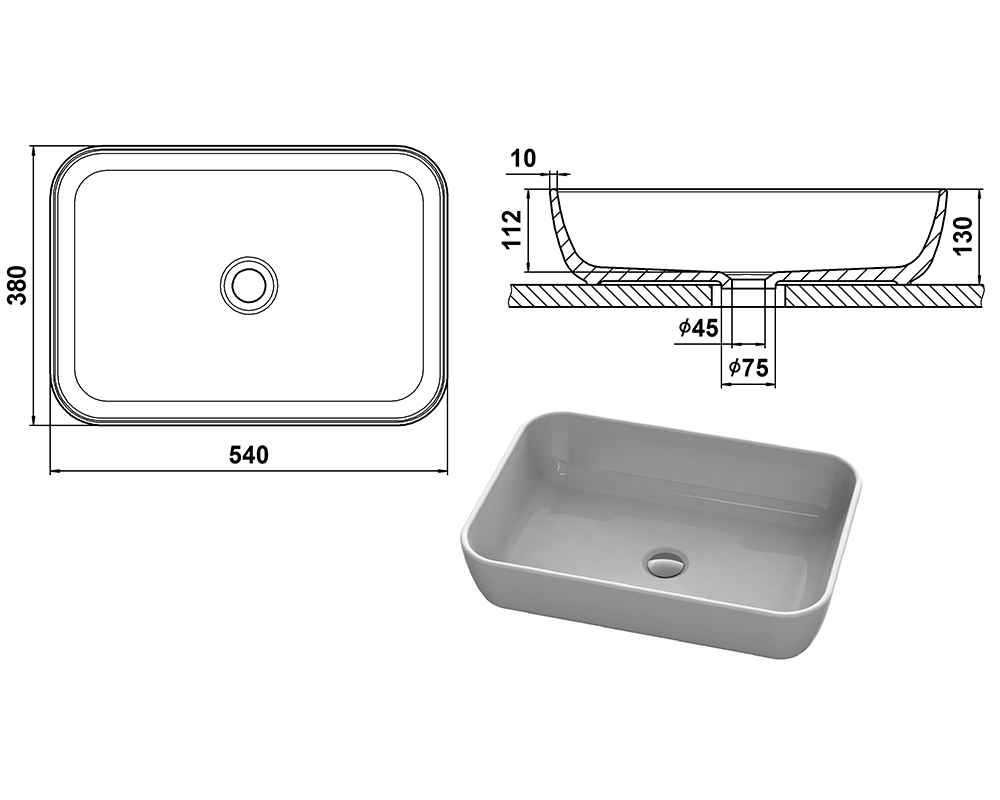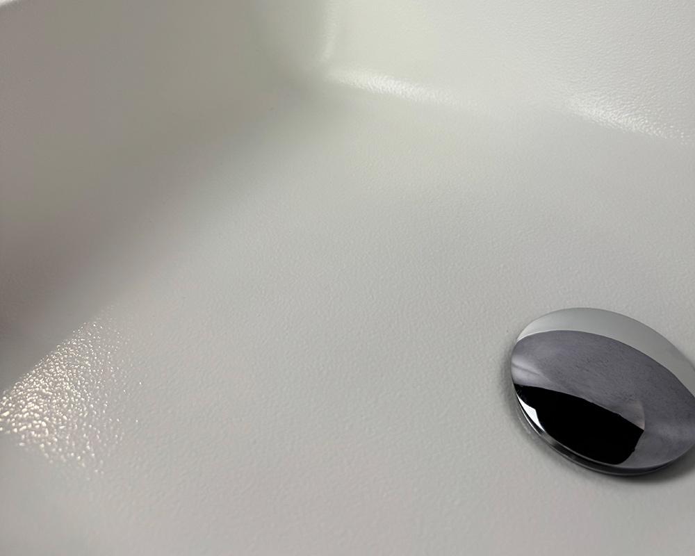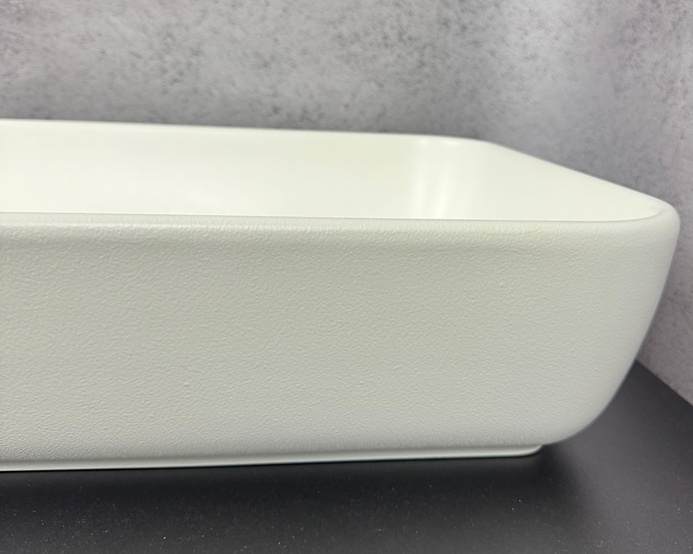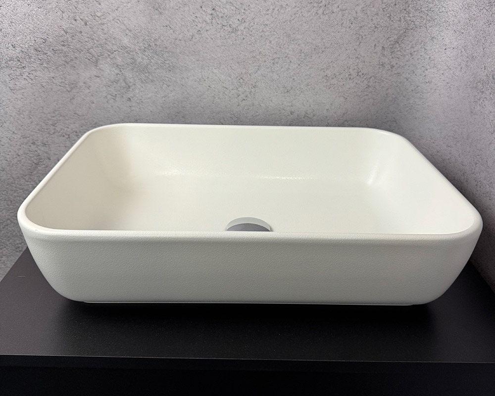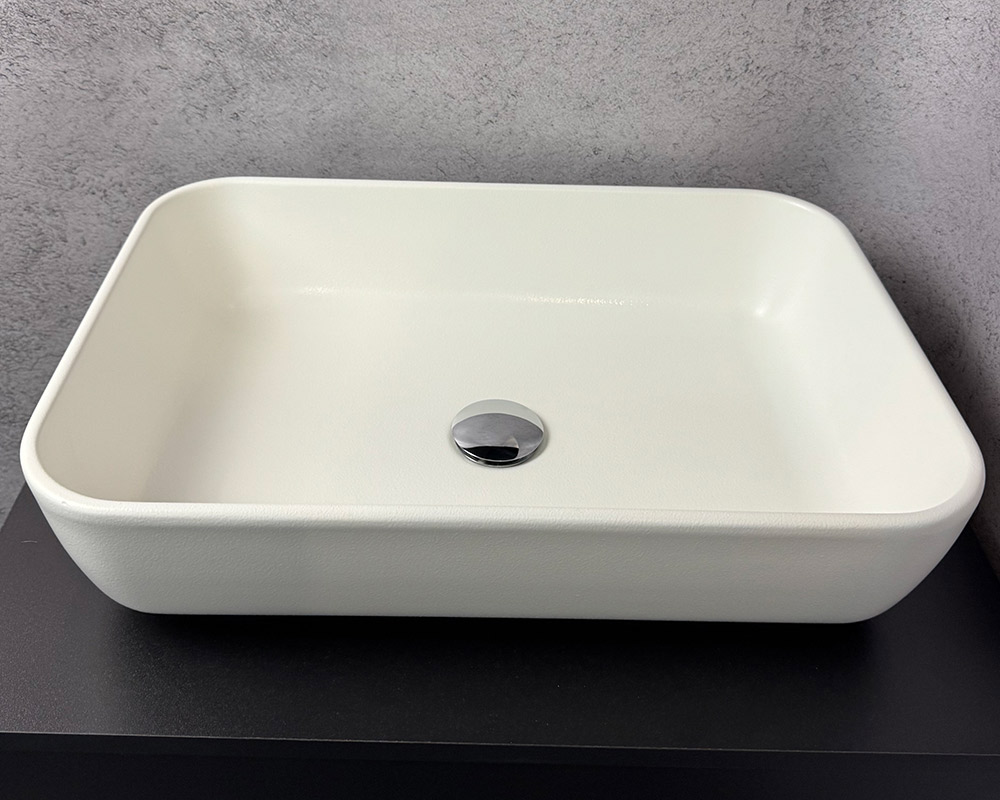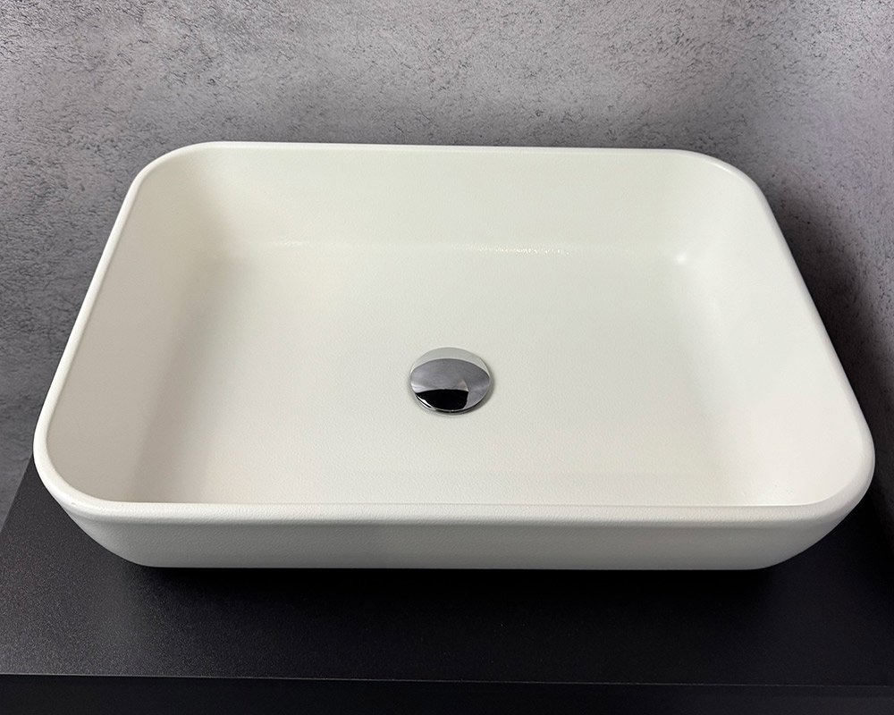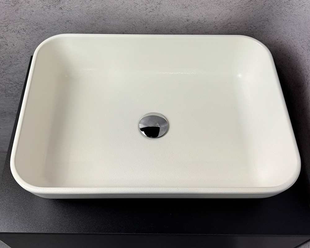 Умивальник виконаний у класичному білому кольорі, що підкреслює його чистоту, свіжість і універсальність. Поверхня має текстуру «шагрень» — дрібнозернисту матову фактуру, яка додає виробу стильності та практичності: на такому покритті менш помітні краплі води й сліди від використання.