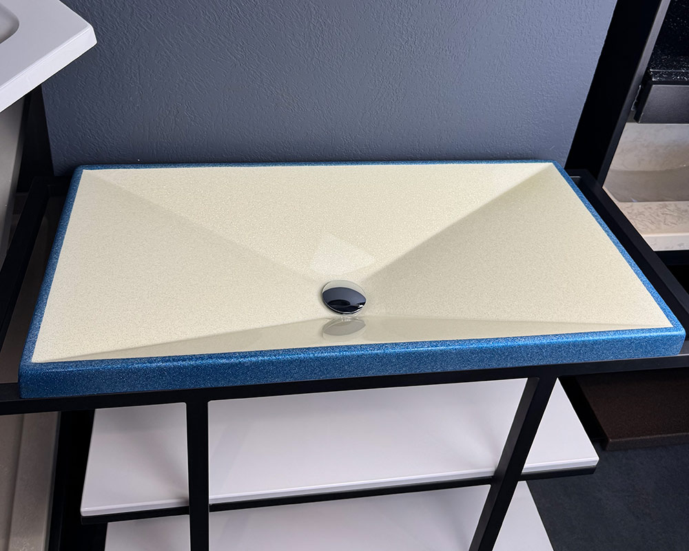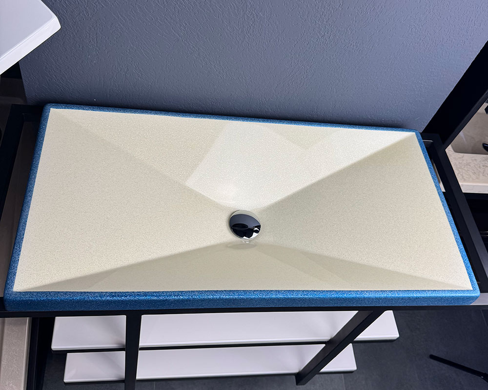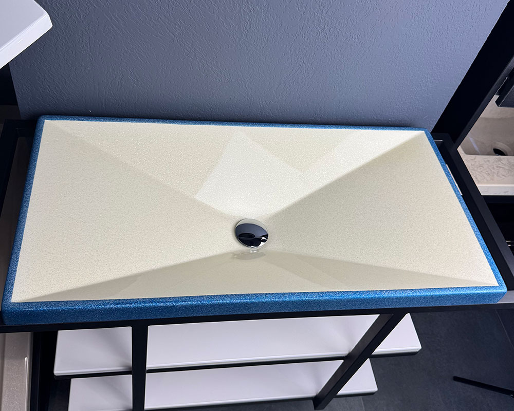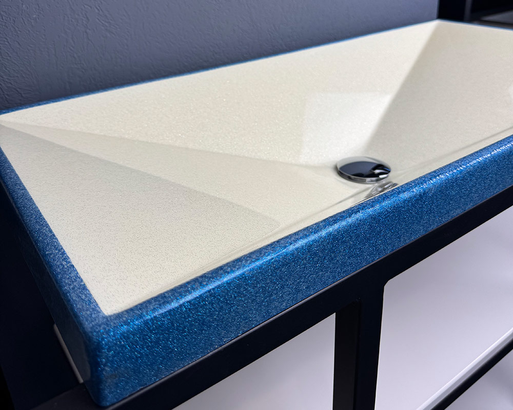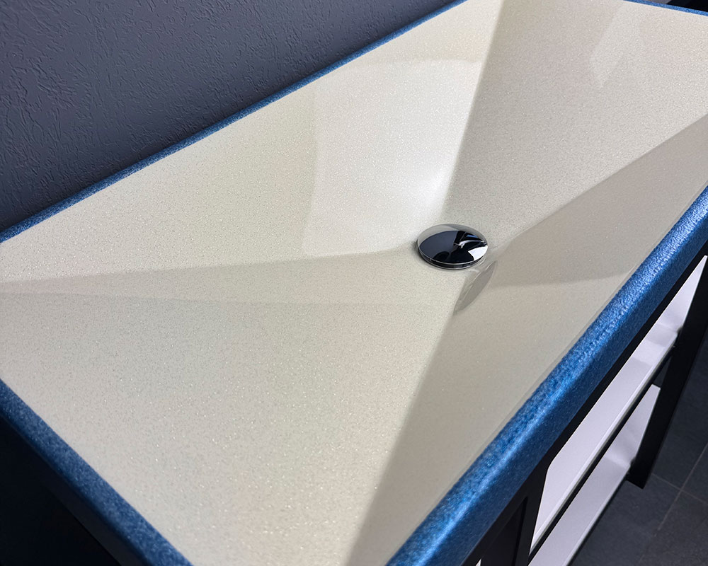 Умивальник має витончене поєднання кольорів: основна частина виконана у світлому перламутрово-білому відтінку з ніжним блиском, що додає легкості та свіжості. По краю йде рамка глибокого синьо-блакитного кольору з мерехтливим ефектом, яка створює яскравий акцент і підкреслює сучасний стиль виробу.