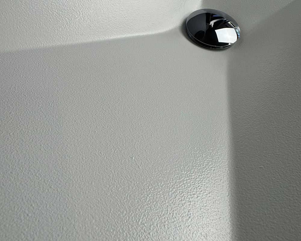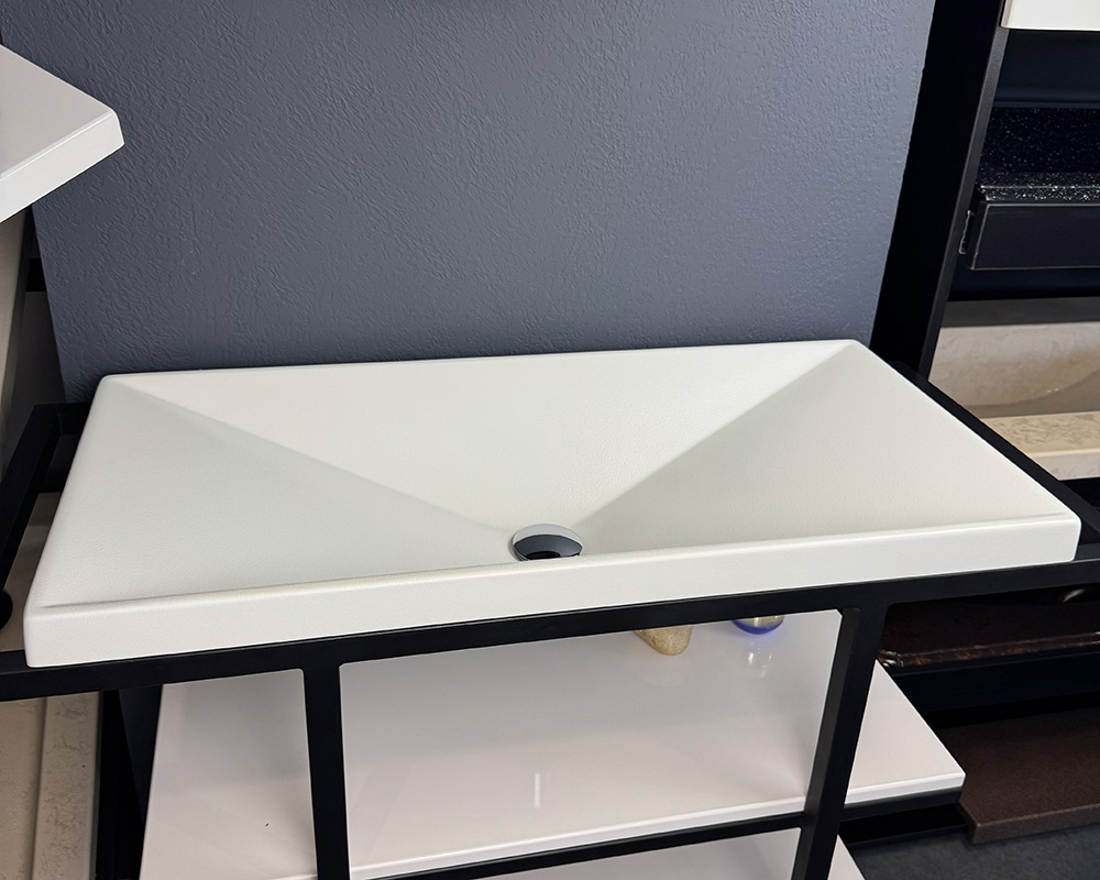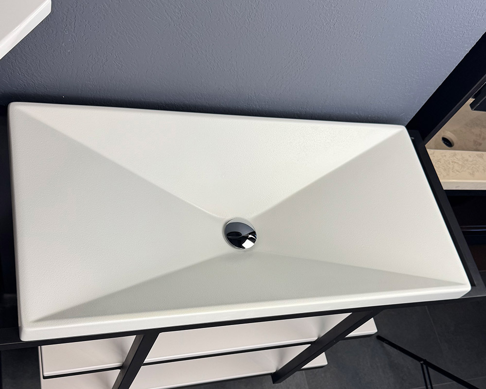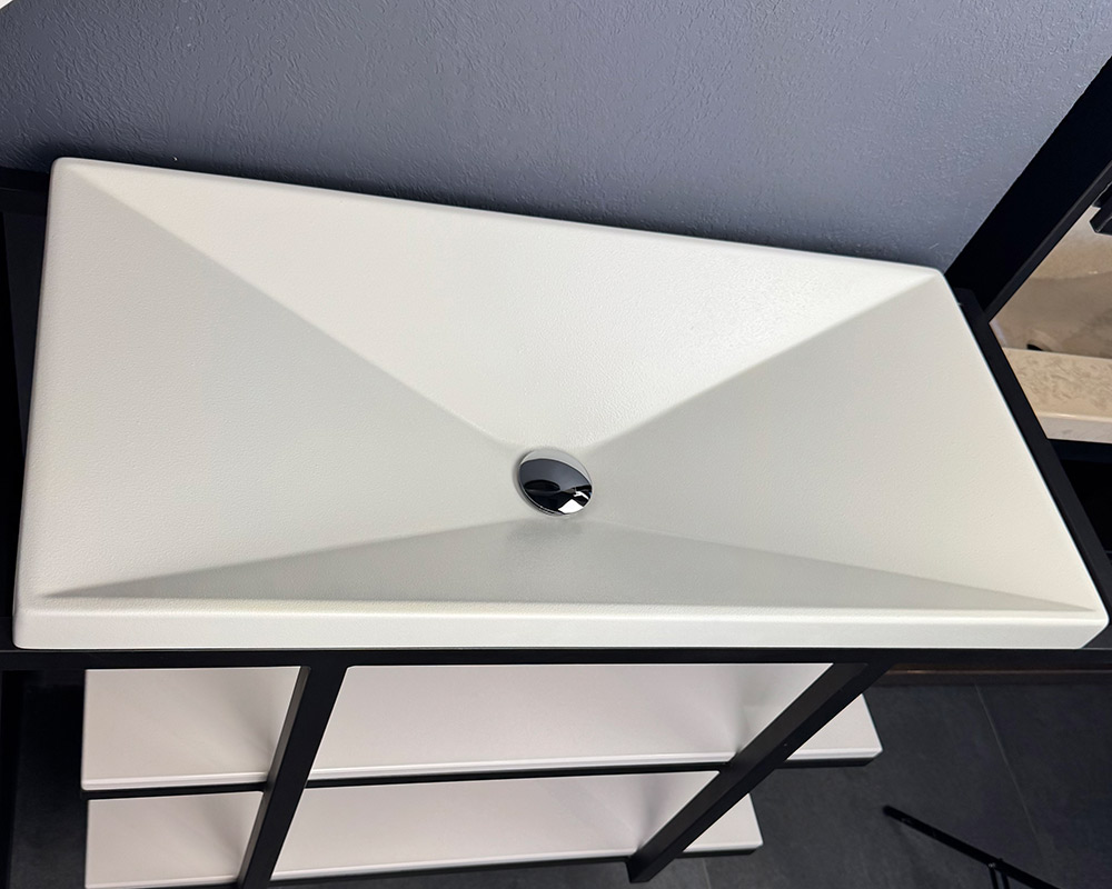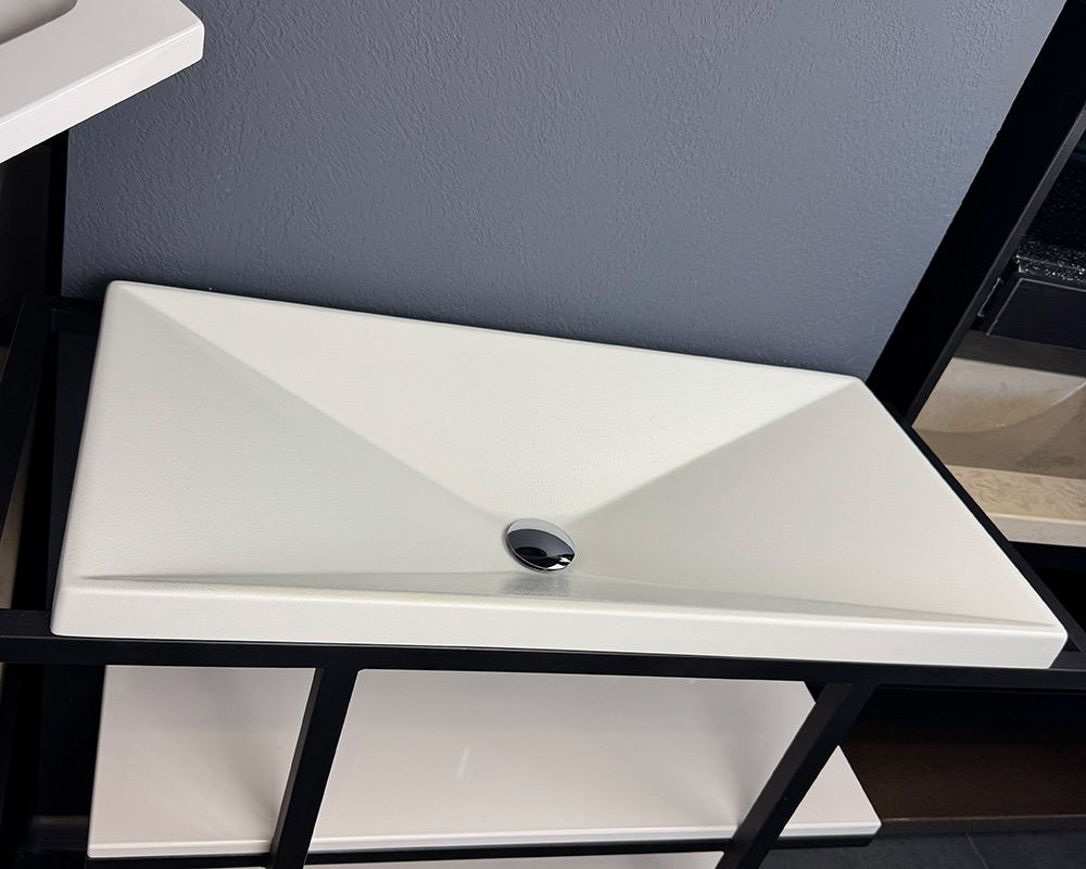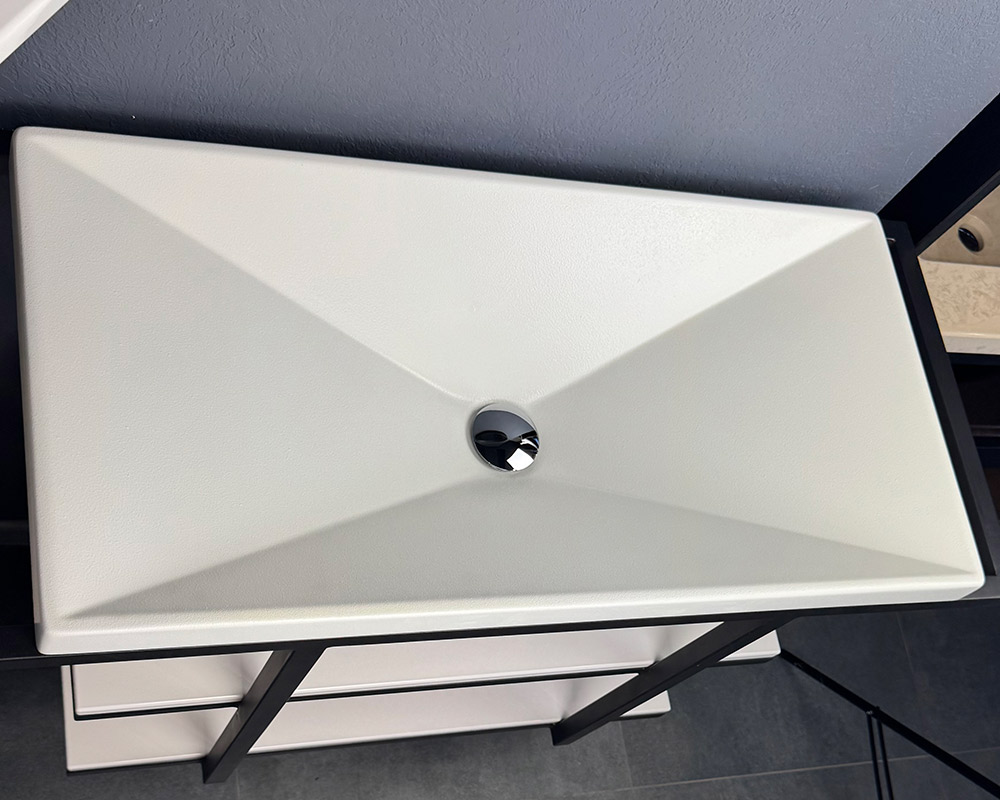 Умивальник виконаний у білому кольорі, що створює відчуття чистоти та елегантної стриманості. Поверхня має текстуру «шагрень» — легку дрібнозернисту фактуру, яка нагадує тонке шкіряне тиснення. Така обробка не лише додає стильного вигляду, а й робить умивальник практичнішим, адже на ній менш помітні краплі води чи сліди використання.