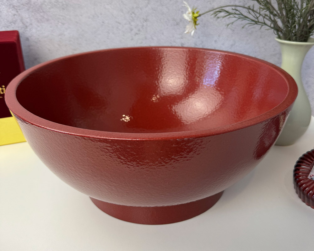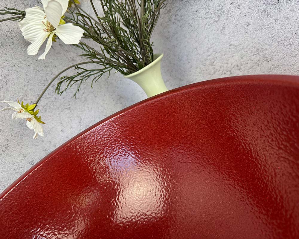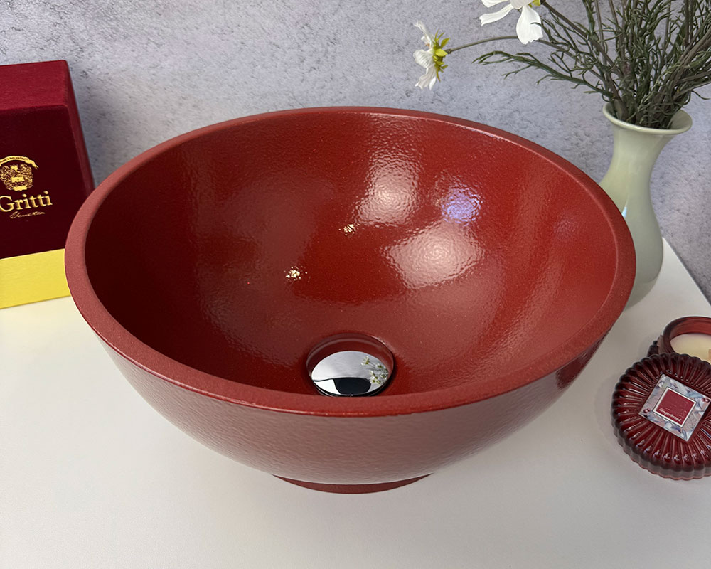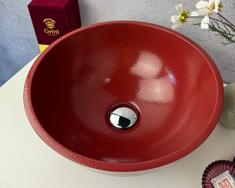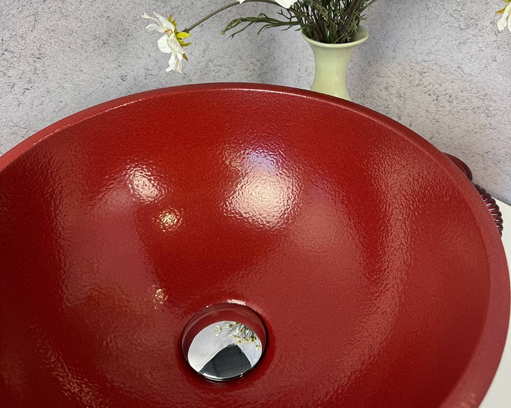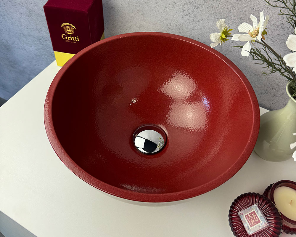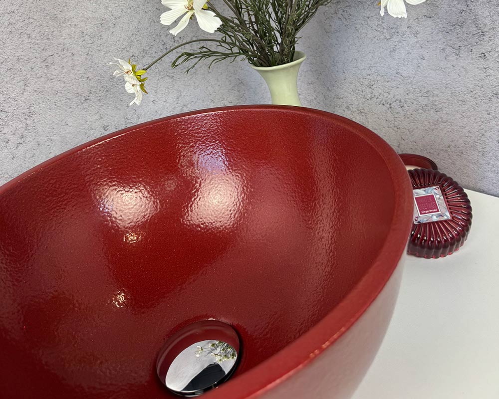 Умивальник на фото має глибокий червоно-бордовий колір із насиченим теплим відтінком. Поверхня умивальника виконана з використанням текстури "шагрень" — це дрібнозерниста фактура, що створює легкий рельєф. Така поверхня не лише додає естетичної глибини, але й практична у використанні: менш помітні подряпини, сліди води та відбитки.