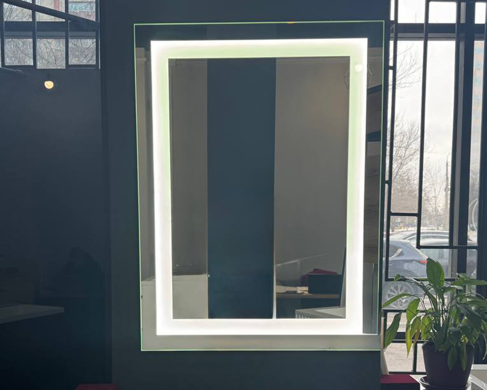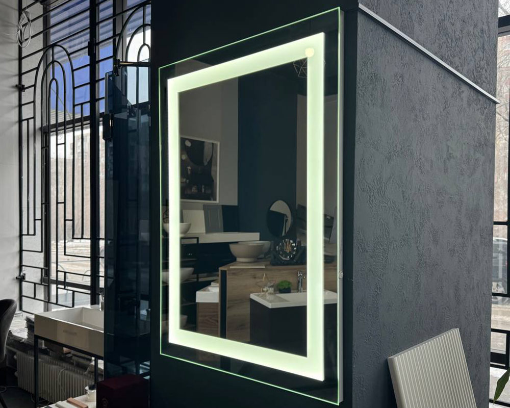 Дзеркало виготовлено зі скла вищої якості, малюнок виконаний піскоструминної обробкою (зняття амальгами - лицьова сторона дзеркала залишається не зворушеним, а малюнок виходить практично прозорим), дзеркало обрамлено рамкою з алюмінієвого профілю, до якої прикріплено світлодіодна стрічка, до неї підведено трансформатор з виходом до підключення електрики.